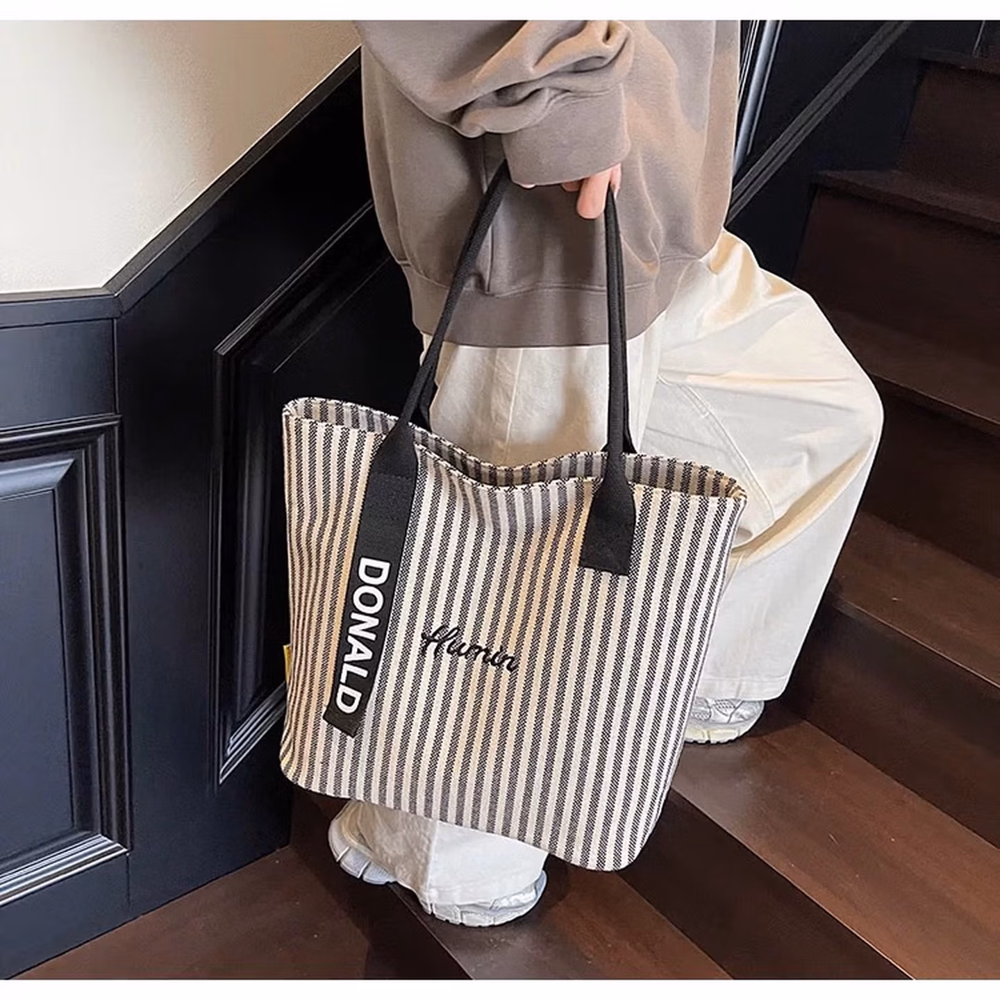 > 科尔洛克条纹大容量帆布包包女2025新款时尚手提单肩购物袋休闲通勤托特包