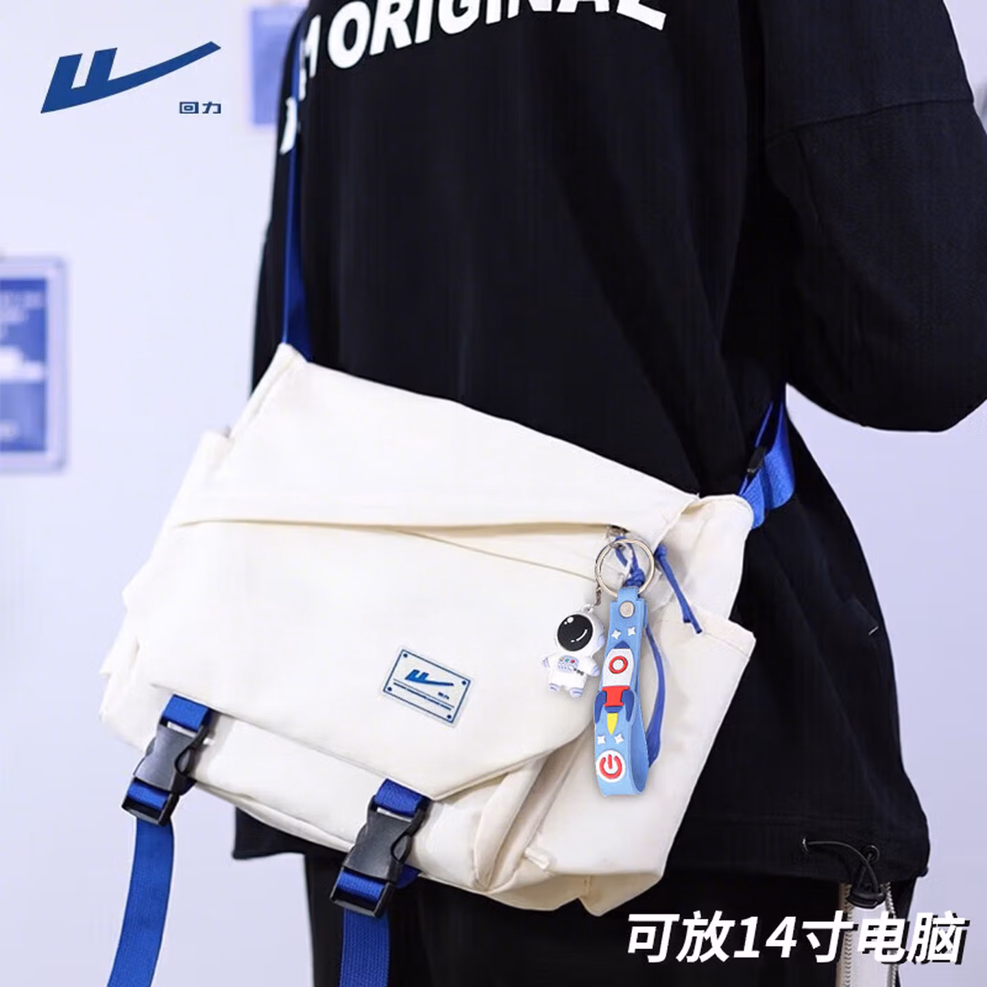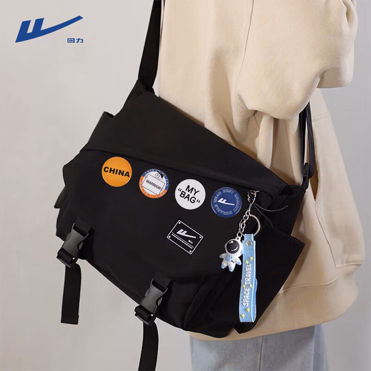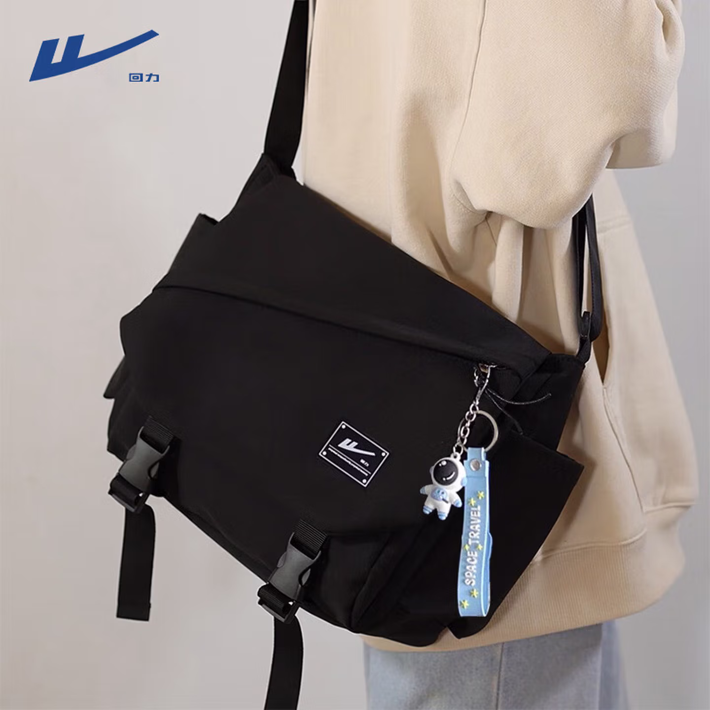 > 回力(Warrior)斜挎包男士挎包男女潮牌大容量单肩包学生情侣休闲运动小背包邮差 黑色【带太空人挂件】