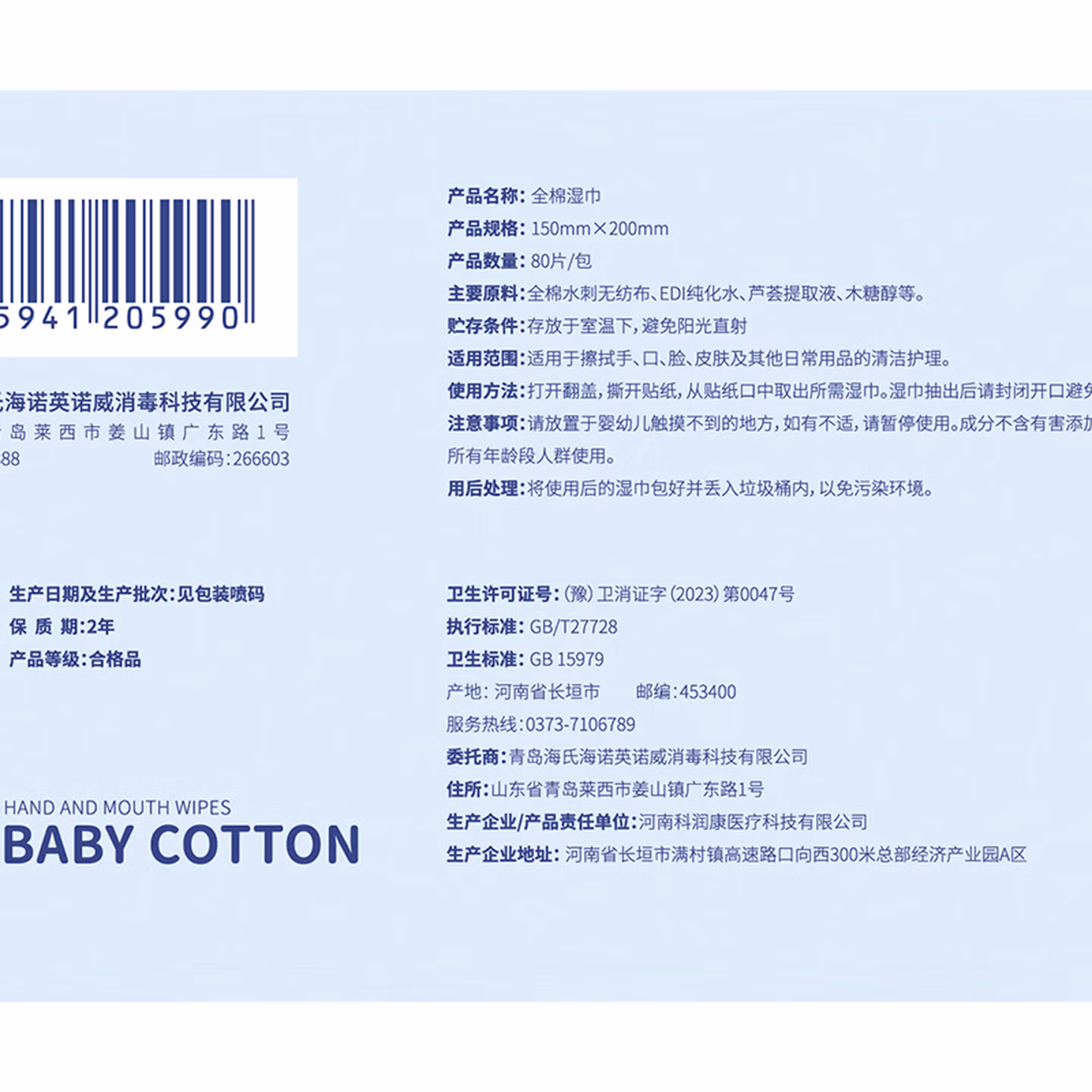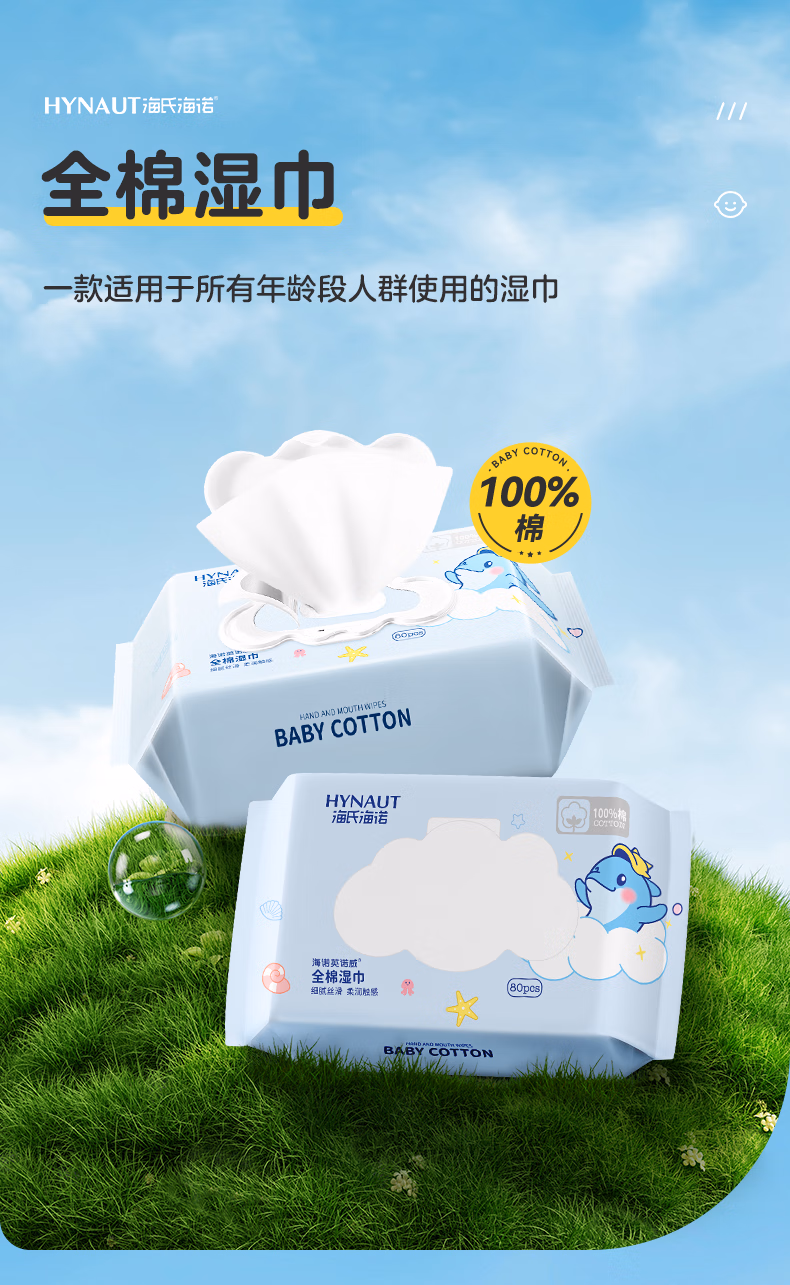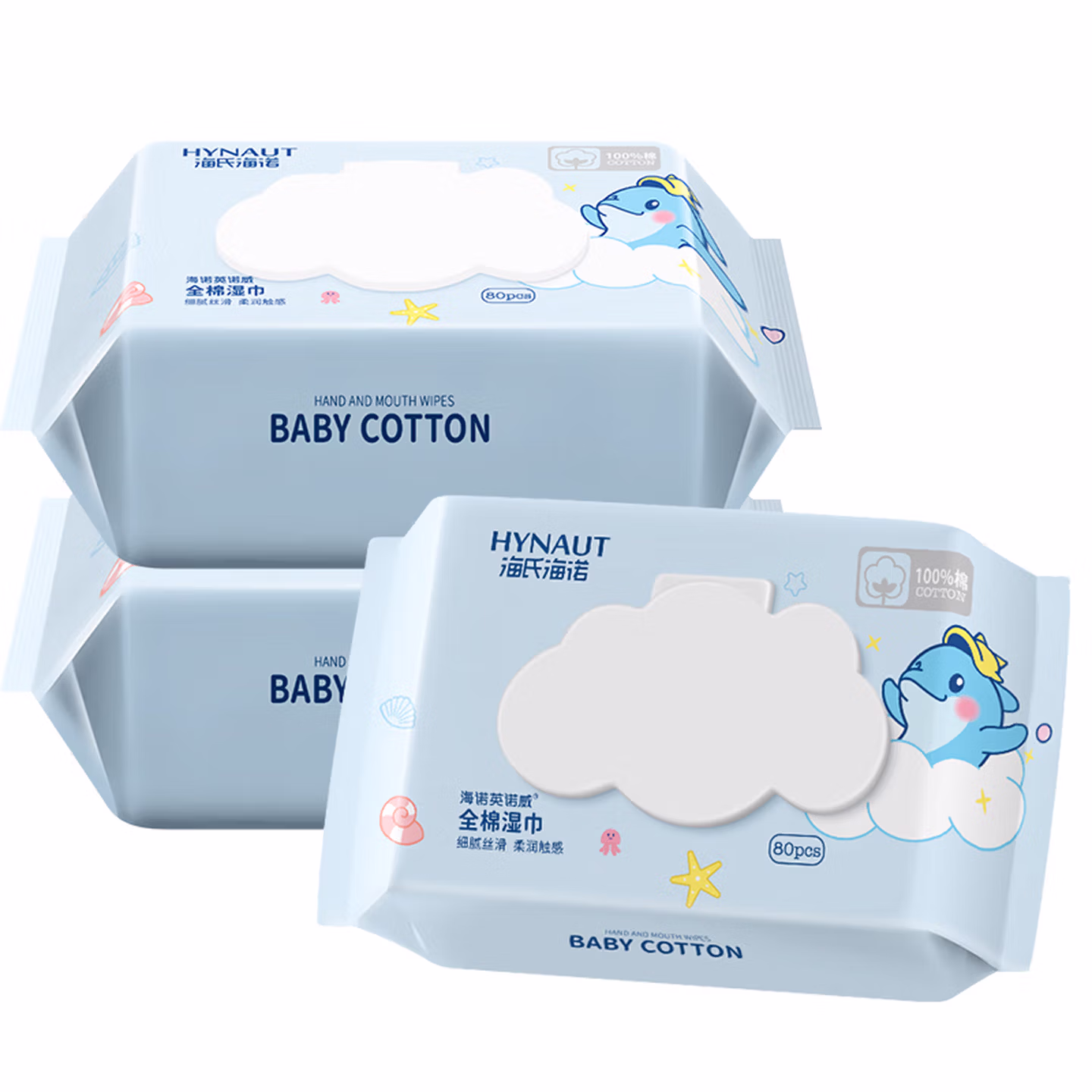 海氏海诺全棉湿巾婴儿手口湿巾湿纸巾宝宝专用棉柔巾不含酒精大包80抽*3包
