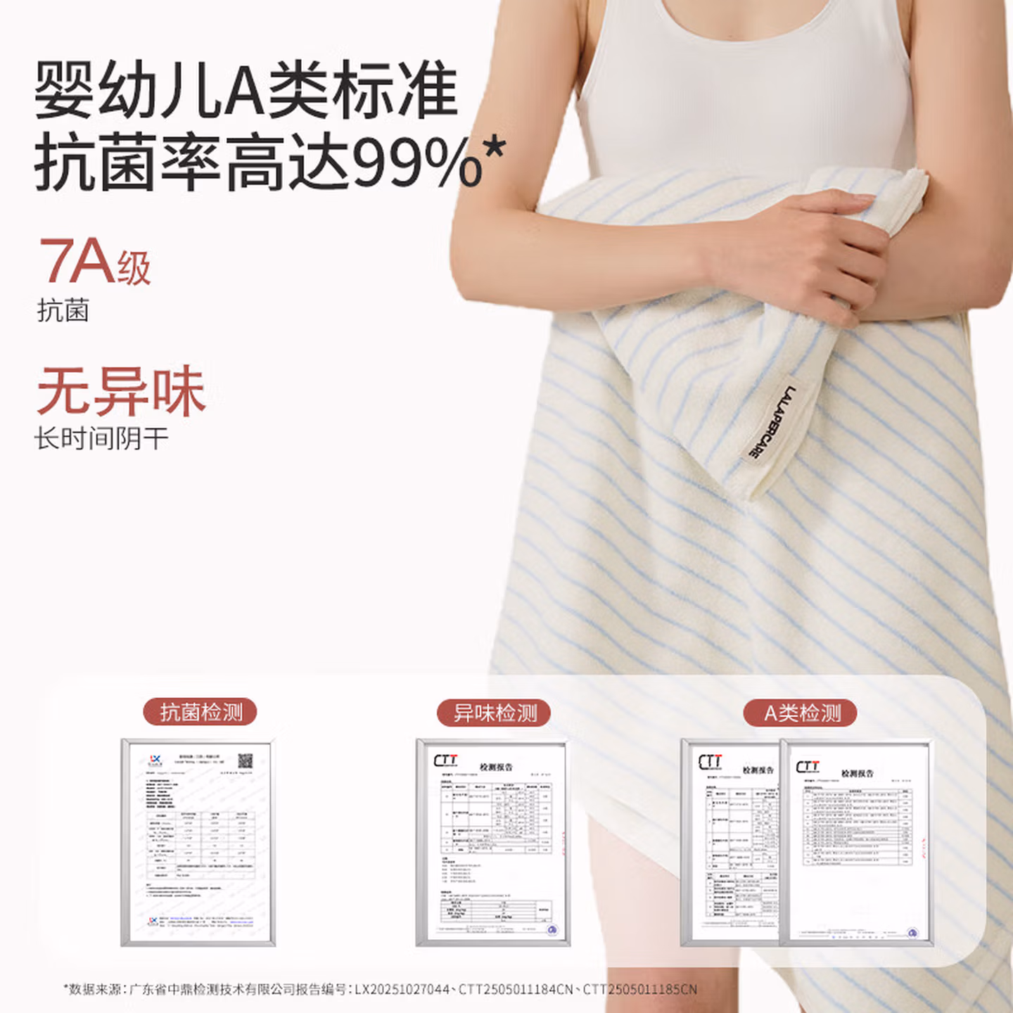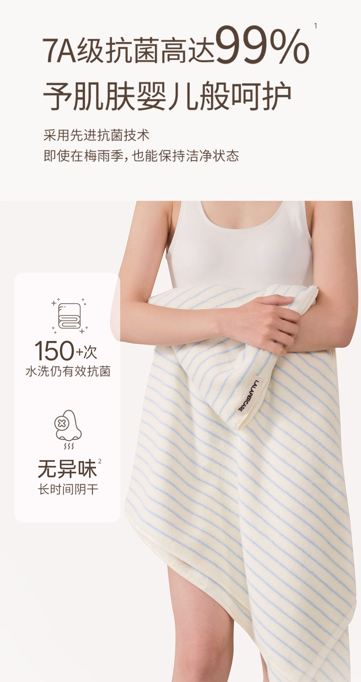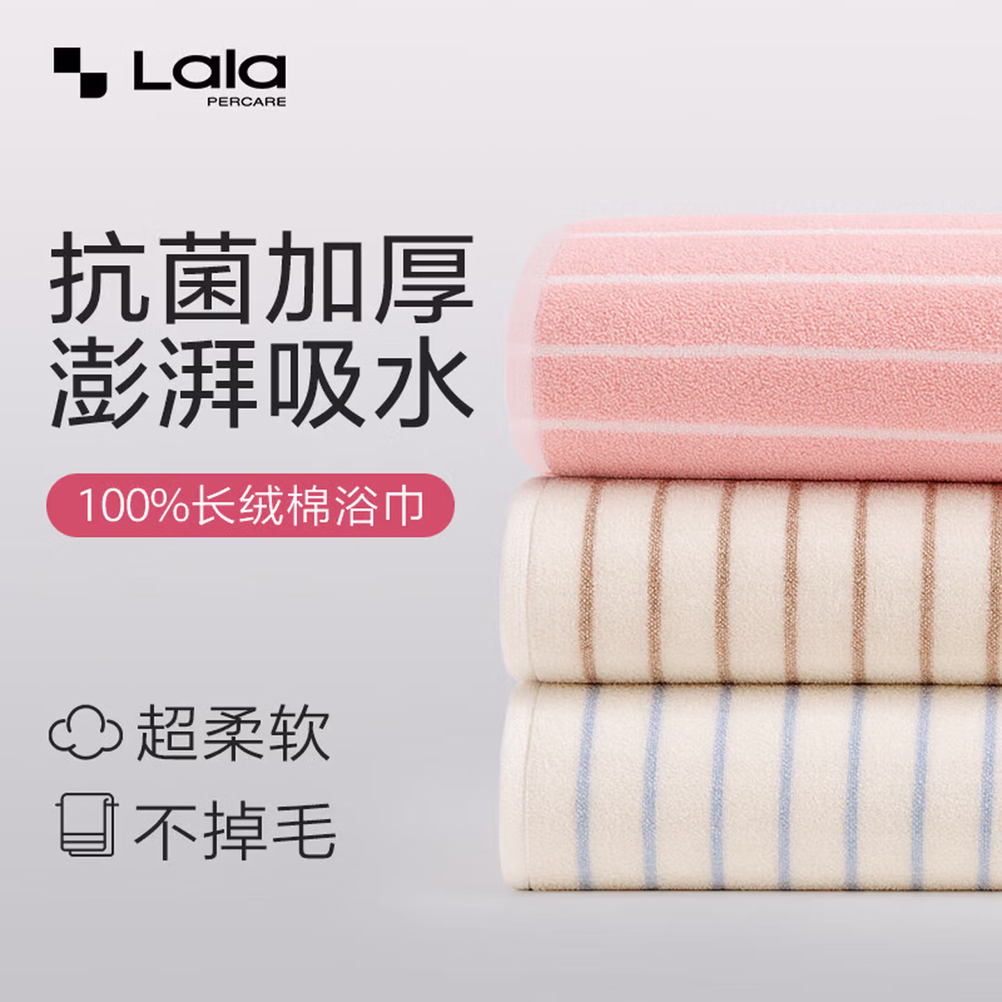 > LALAPERCARE618g纯棉云柔条纹浴巾加大加厚超吸水7A抗菌浴巾粉白成人浴室毛巾