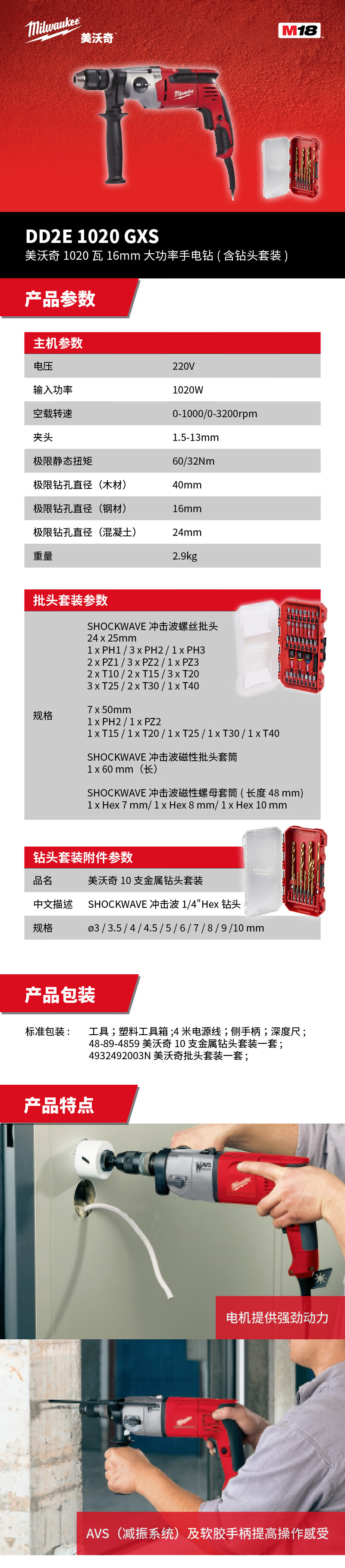 > 美沃奇 DD2E 1020 GXS 1020瓦16mm大功率手电钻(含钻头套装) 其他 30天