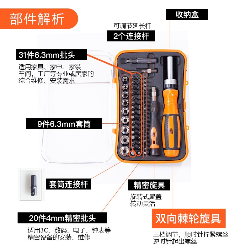 工蜂棘轮省力手柄65合1螺丝刀套装电讯五金手提工具箱组3当调节螺丝手柄家用起子套装