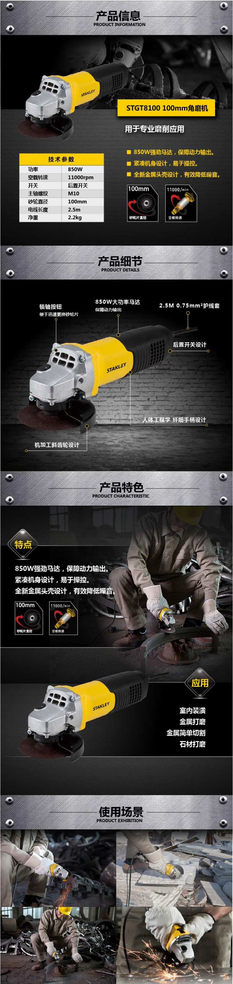 史丹利(STANLEY)100MM角磨机850W砂轮切割机打磨抛光机后置开关STGT8100