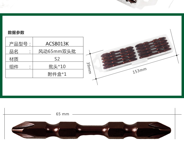 > 雷蒙 ACSB013K 风动双头批电动螺丝刀磁性批头 65mmPH2 十支装