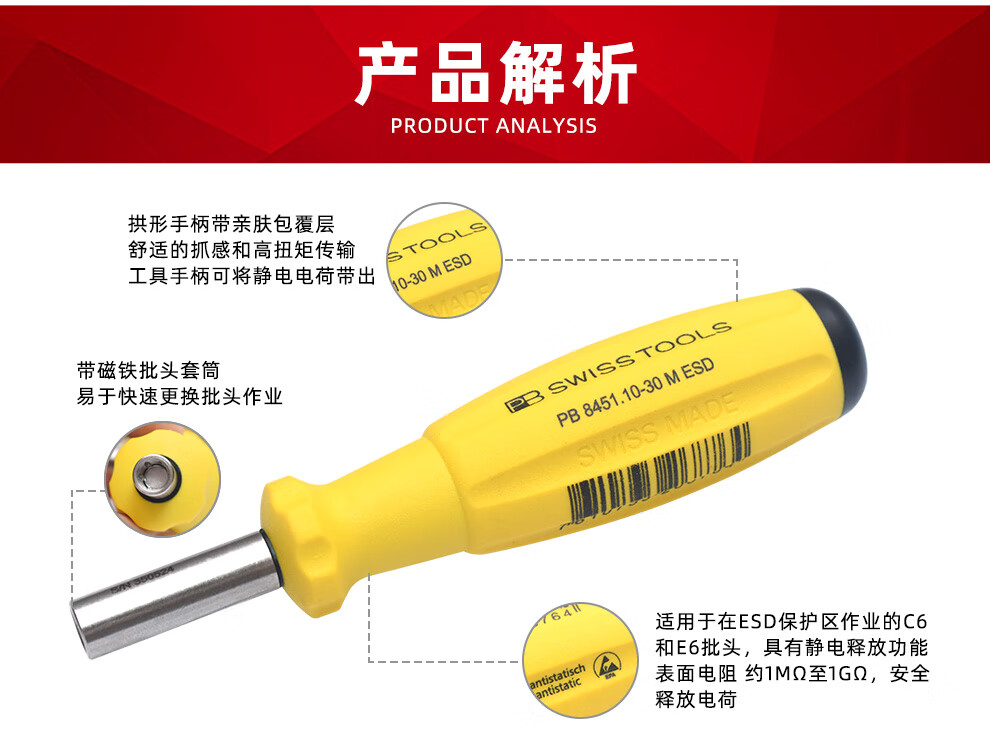 > PB SWISSTOOLS瑞士进口防静电螺丝刀手柄可换批头套筒多功能手动起子组合ESD PB 8451.10-30 M ESD