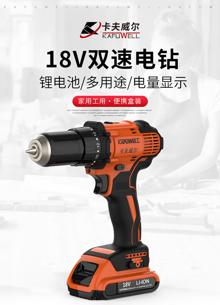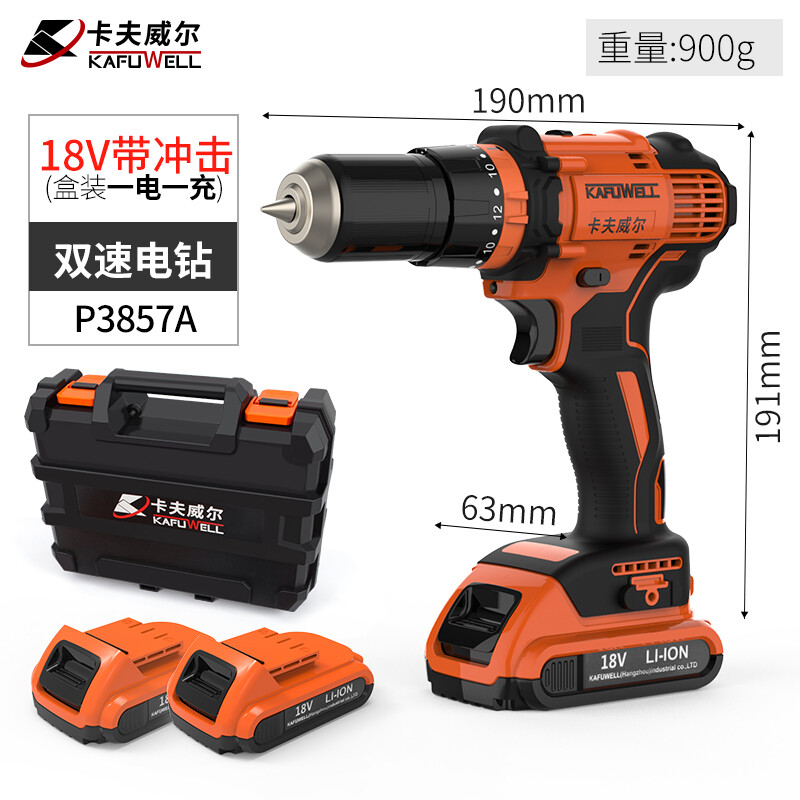 > 卡夫威尔 18V双速带冲击电钻 家用充电钻 大功率电动螺丝刀 墙面打孔拧螺丝电起子 两电一充 P3857A