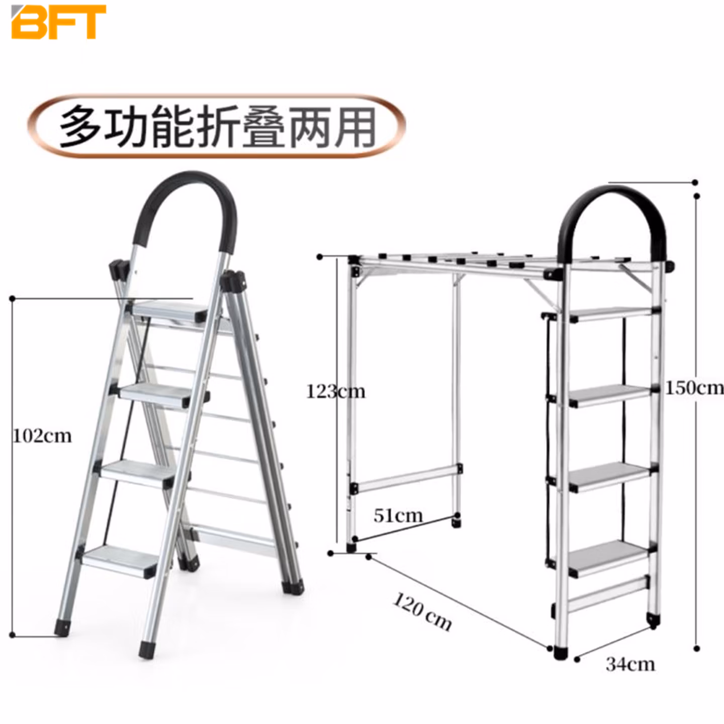 > 贝傅特 多功能人字梯 伸缩折叠人登高晾衣架两用加厚铝合金 三步基础款(无晾晒功能)