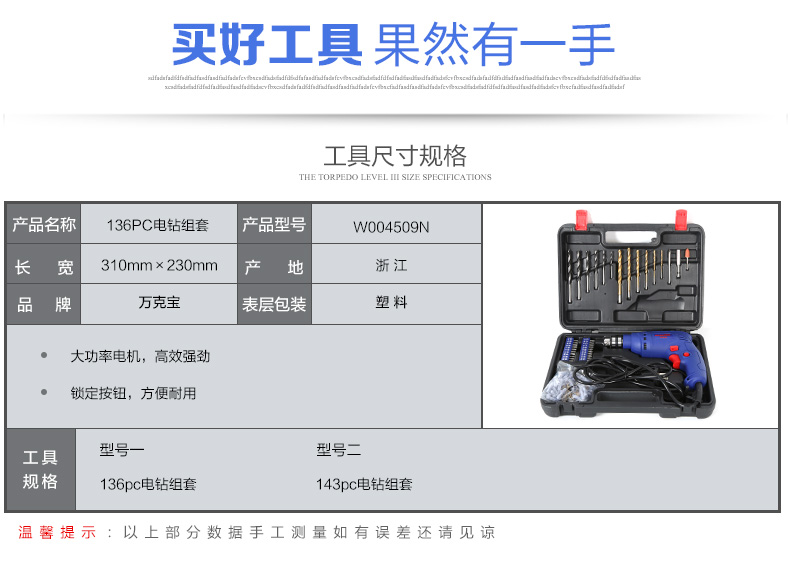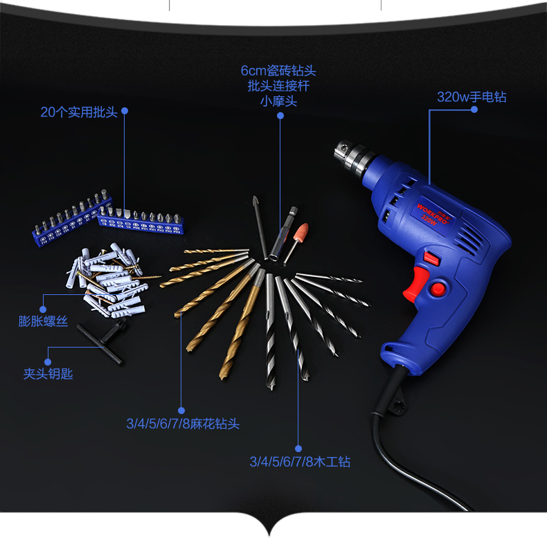> 万克宝(WORKPRO)W004509N 家用电钻套装 多功能微型手电钻 五金维修工具组套