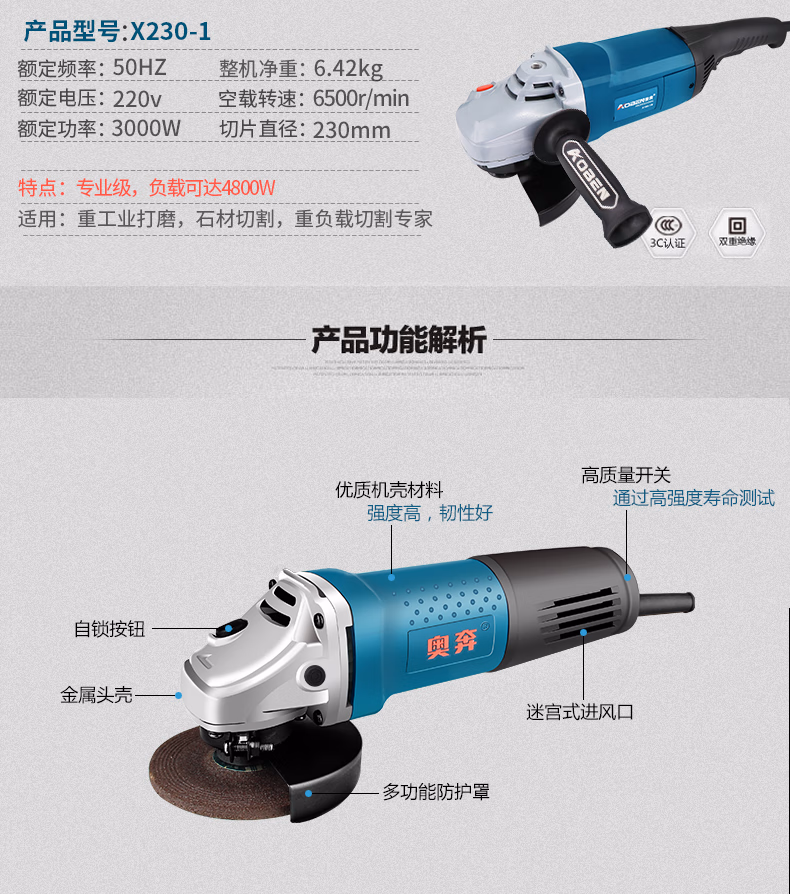 奥奔 (AOBEN) AB1859T角磨机710W多功能大功率切割机家用手磨机工业打磨机石材木材金属抛光机手砂轮电动工具