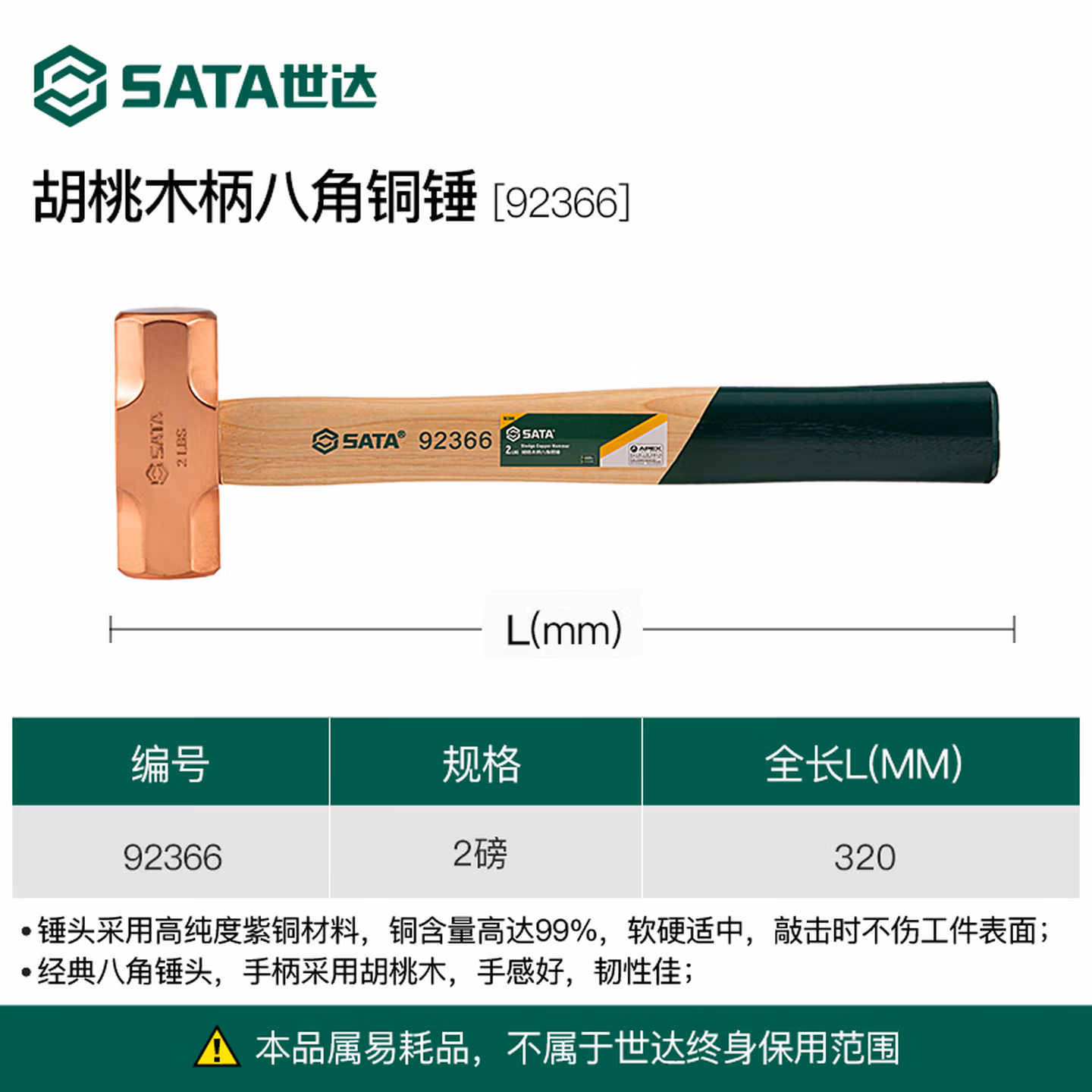 > 世达工具紫铜锤胡桃木柄八角铜锤1磅/3磅 胡桃木柄八角铜锤1磅 92365
