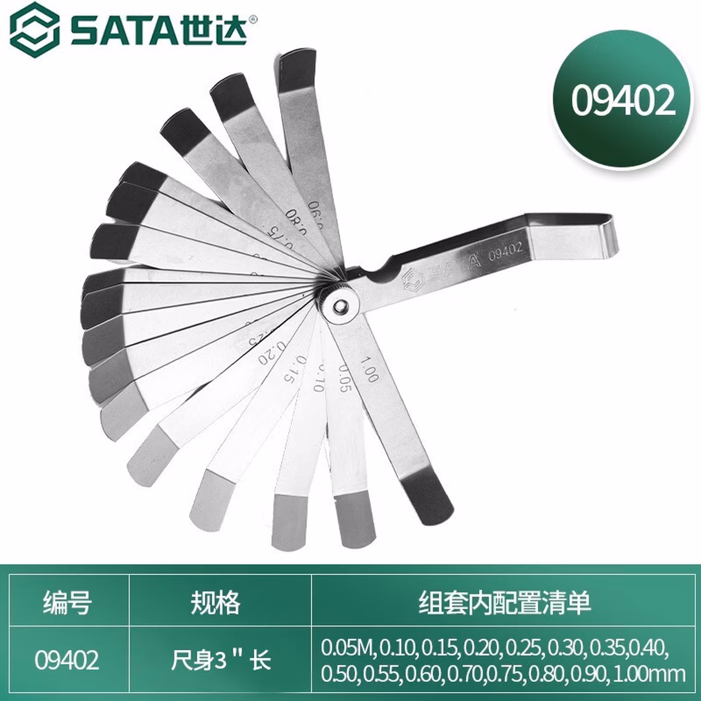 > 世达(SATA) 16件套公制塞尺 0.05-1.00mm高精度不锈钢 间隙片塞规厚薄规 测微 09402 现货