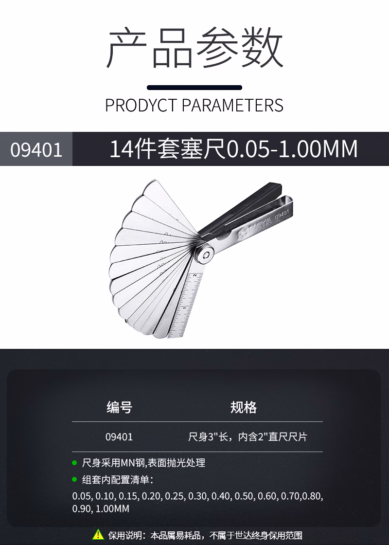 世达(SATA) 16件套公制塞尺 0.05-1.00mm高精度不锈钢 间隙片塞规厚薄规 测微 09402 现货