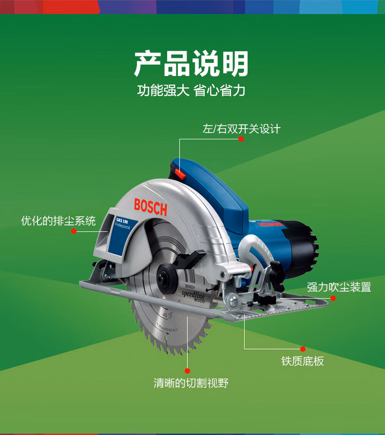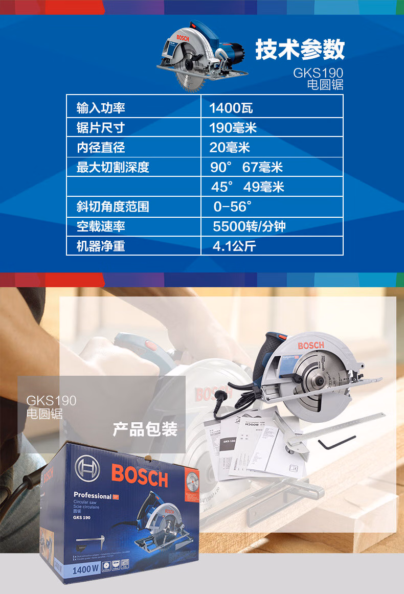 博世(BOSCH)电圆锯 切割机 多功能电锯 家用木工锯 GKS190
