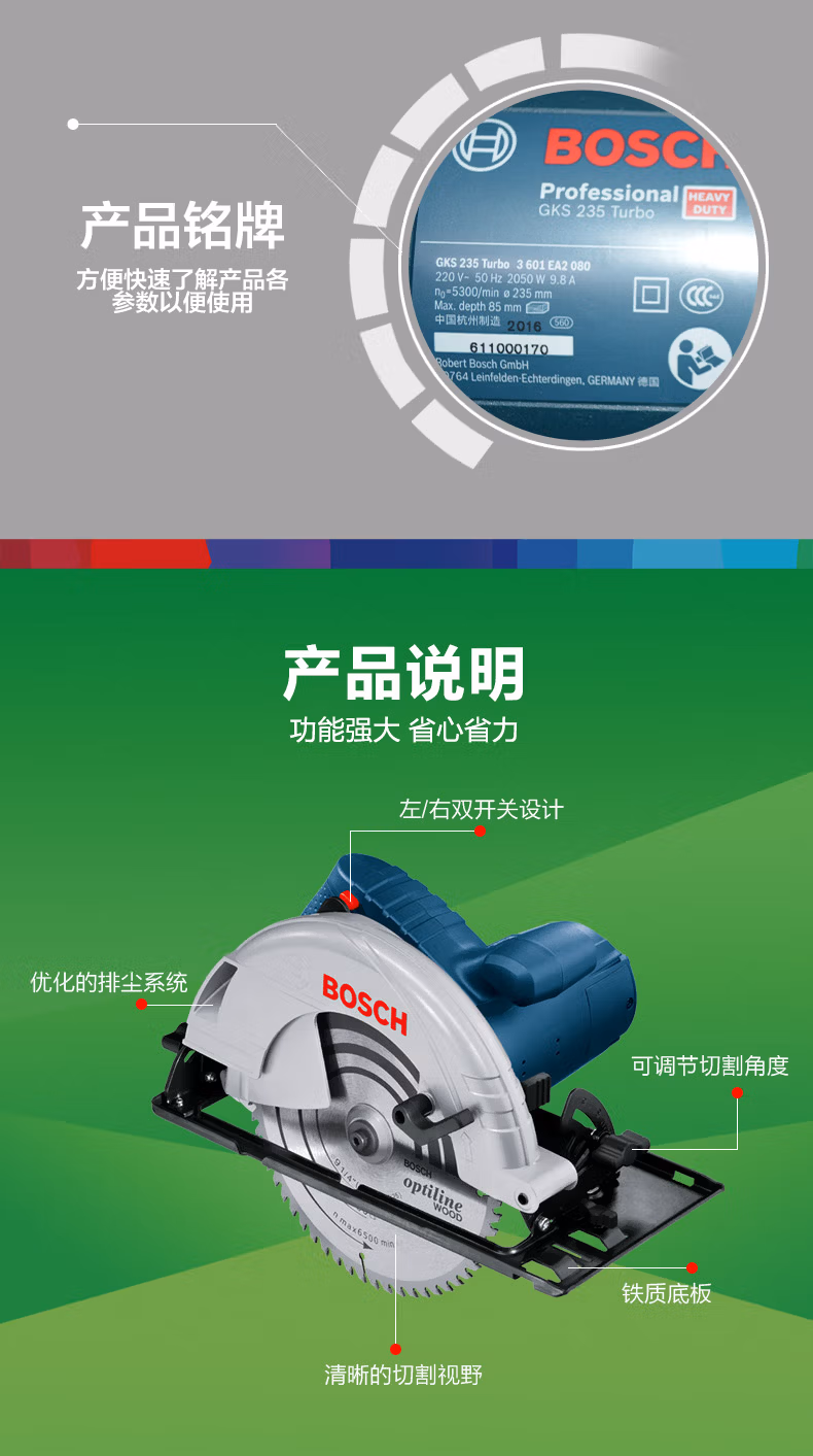 博世(BOSCH)切割机电圆锯9寸GKS235木工电锯手提2050w圆盘锯家用木板铝塑板