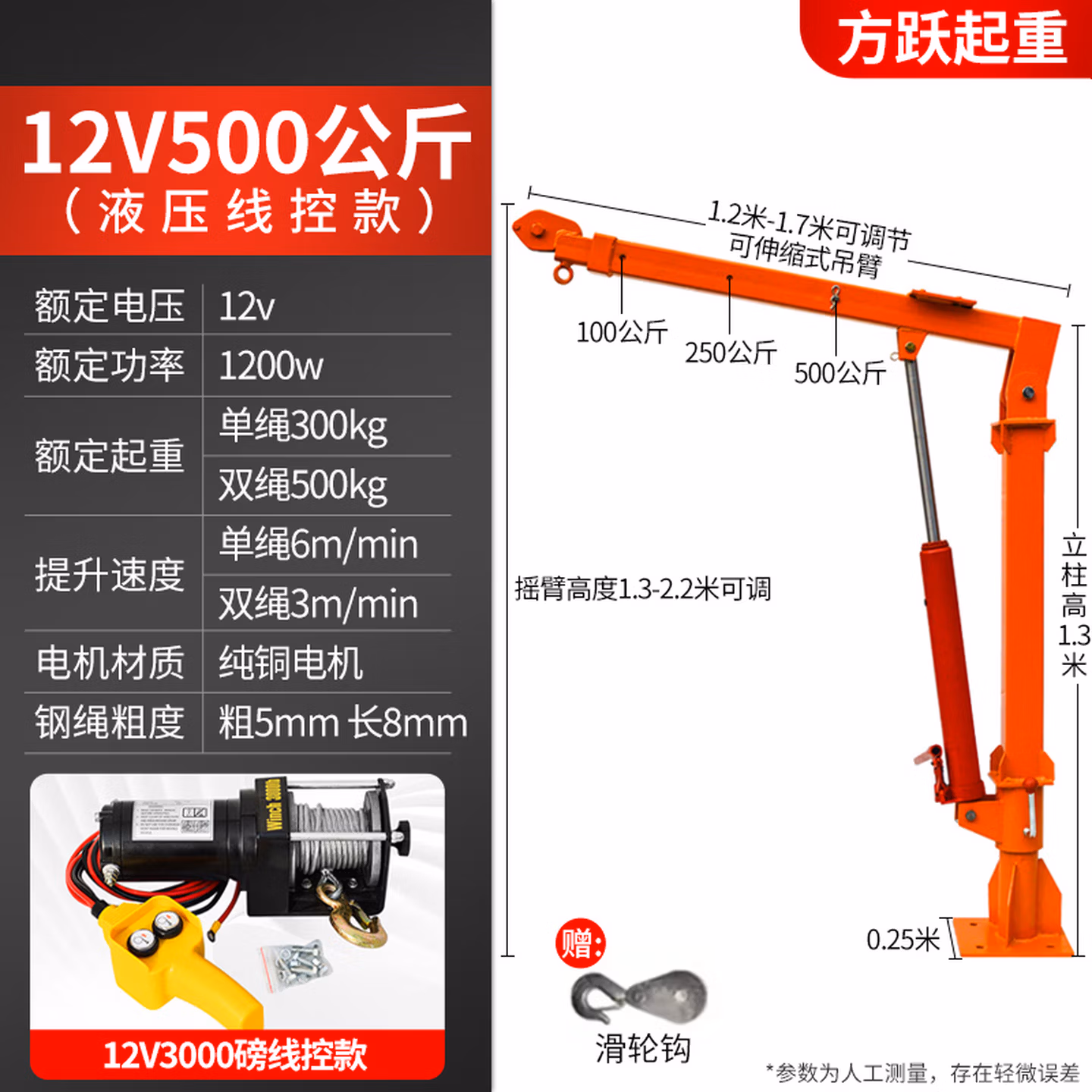 车载吊机12v24v随车吊货车三轮1吨220v吊机架家用小型升降起重机 12v500公斤国标加厚【线控】