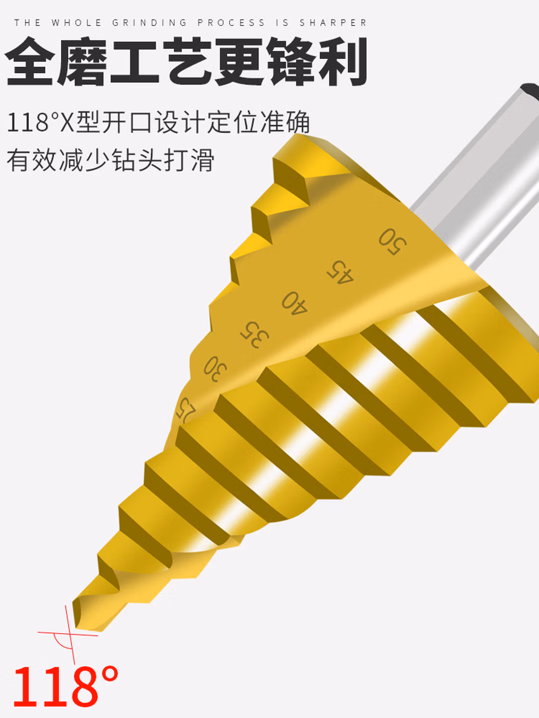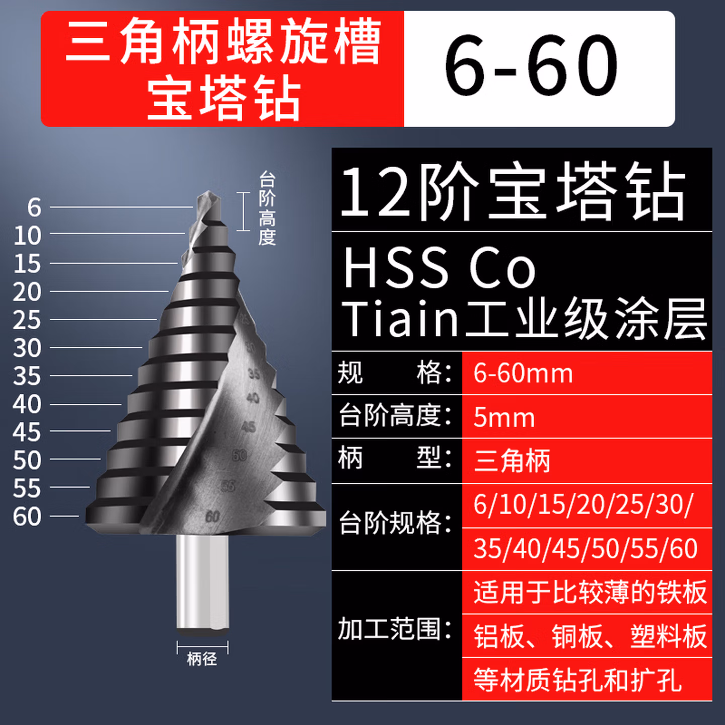 科至途高速钢镀钛阶梯钻螺旋槽三角铁板开孔器多功能金属宝塔钻头10-45 10-45(4241材质)柄12.7刃80螺旋