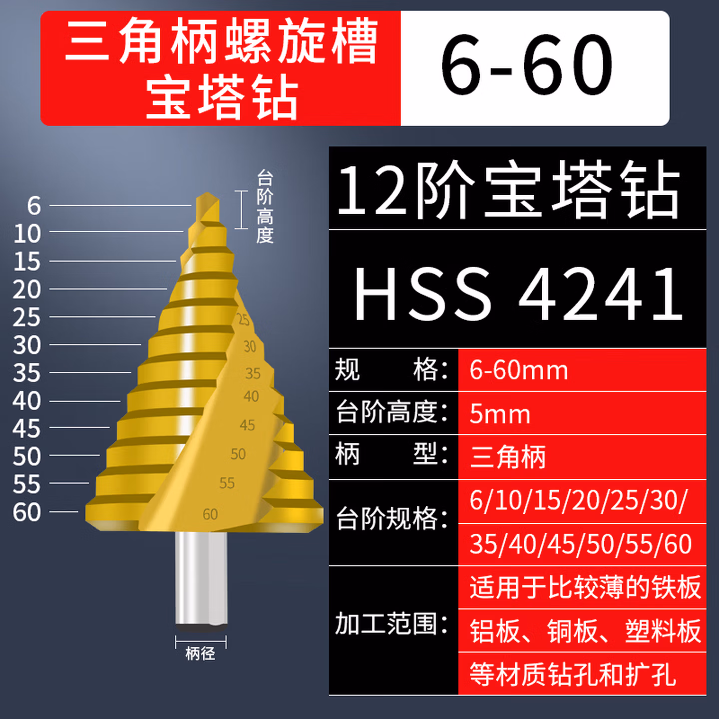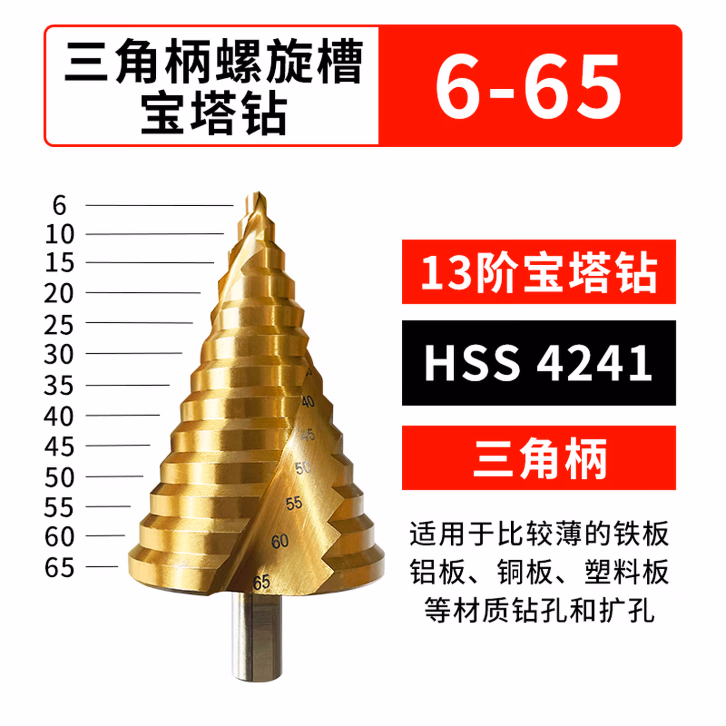 > 科至途高速钢镀钛阶梯钻螺旋槽三角铁板开孔器多功能金属宝塔钻头10-45 10-45(4241材质)柄12.7刃80螺旋