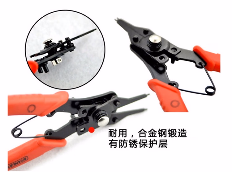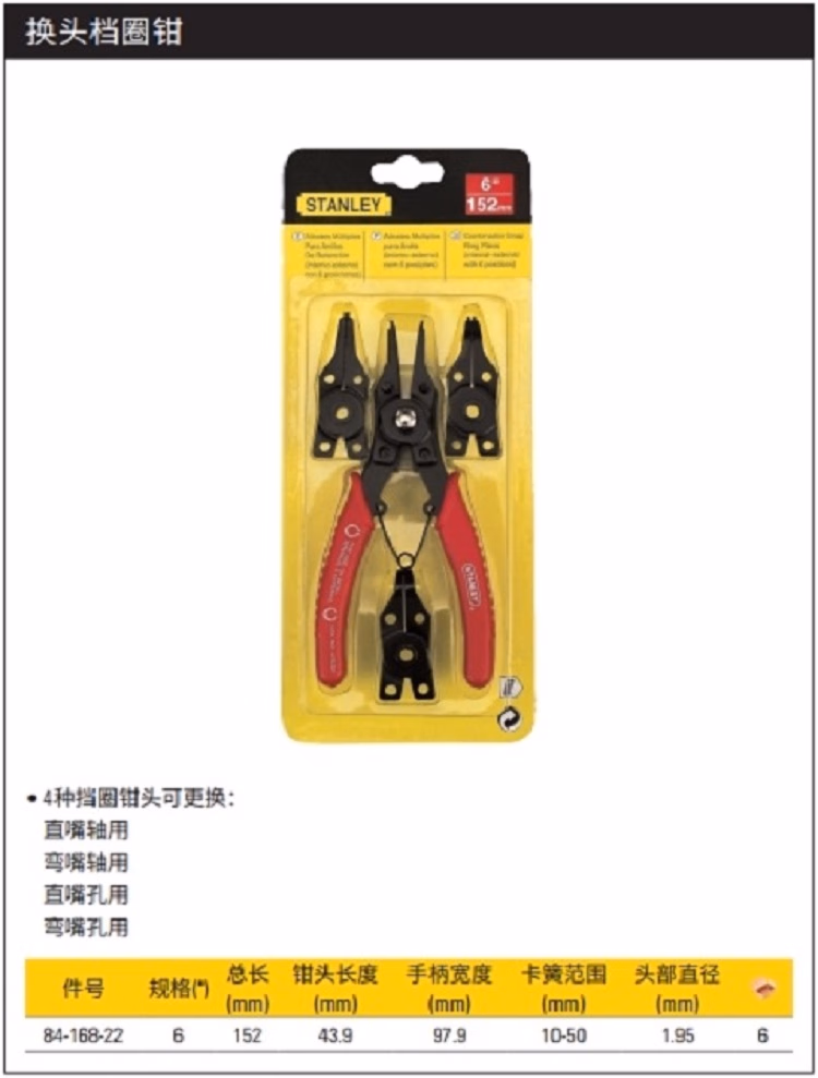 > 史丹利(STANLEY)换头挡圈钳6英寸弹簧钳挡圈钳内卡外卡轴用孔用卡簧钳84-168