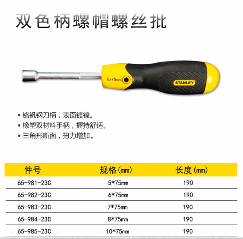 > 史丹利(STANLEY)双色柄螺帽螺丝批5x75mm塑柄套筒扳手花型起子65-981