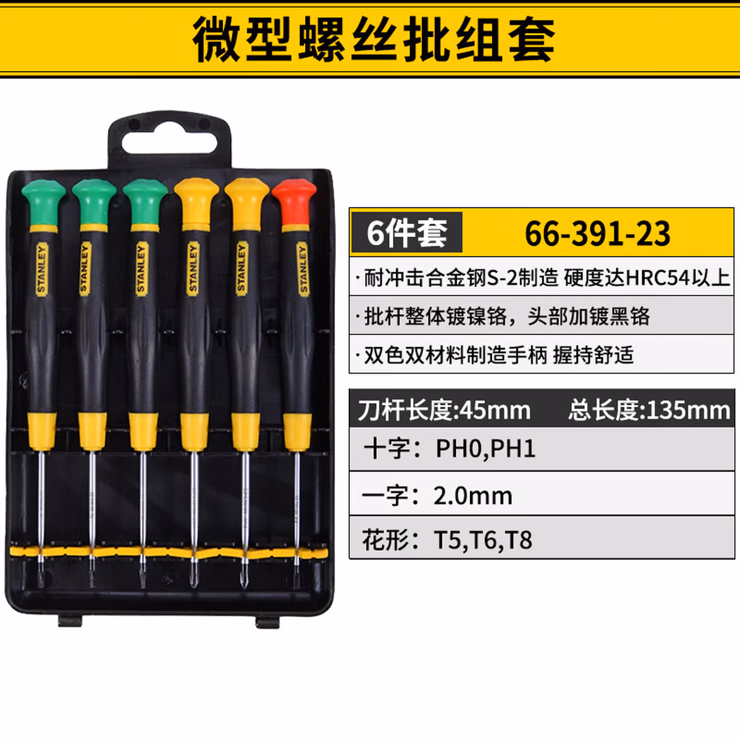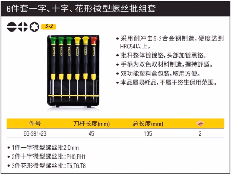 > 史丹利(STANLEY)6件套一字十字花形微型螺丝批组套电子精密改刀套装66-391