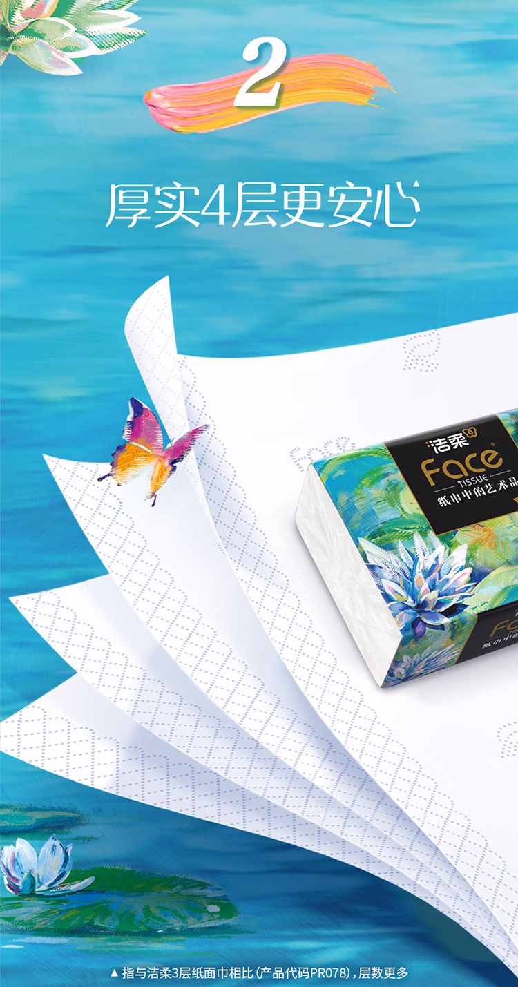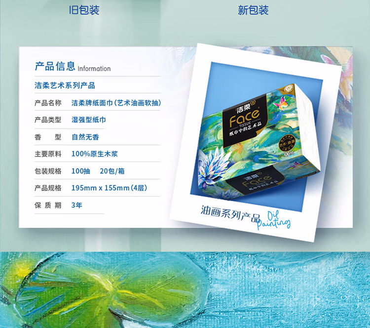 > 洁柔抽纸 油画Face4层100抽*20包 加大加厚195mm*155mm 亲肤纸巾 整箱