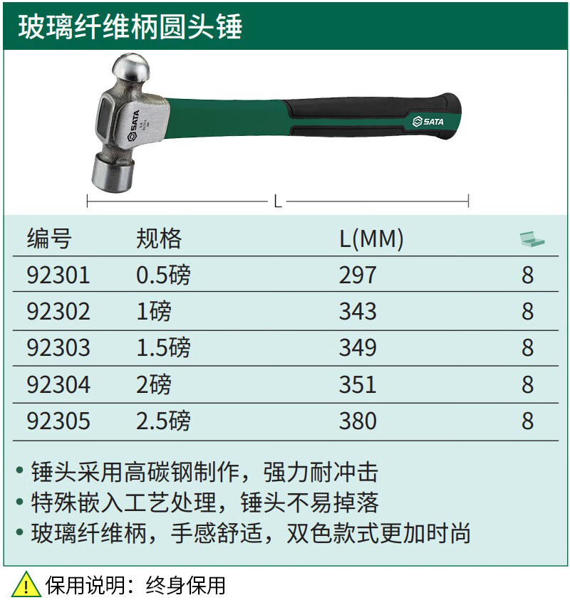 世达(SATA)92311-92315 木柄圆头锤 92311 木柄圆头锤0.5磅