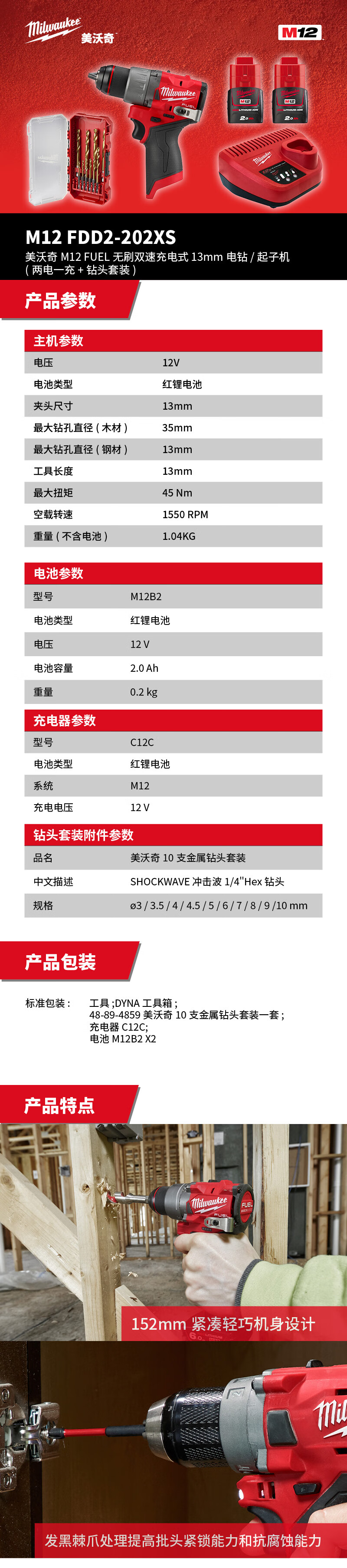 > 美沃奇 M12 FDD2-202XS M12 FUEL无刷双速充电式13mm电钻/起子机(两电一充+钻头套装)