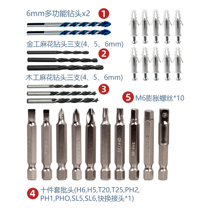 手电钻冲击钻电动螺丝刀电动工具附件 金工钻*1木工钻*1多功能钻*1膨胀螺丝*10