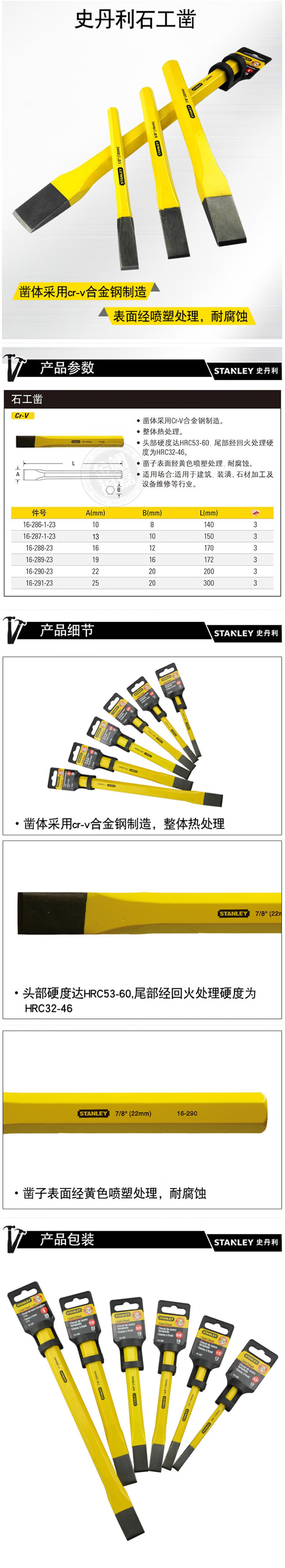 史丹利(STANLEY)石工凿12mm水泥扁凿錾子样冲石器石匠锤子钢凿钎16-287