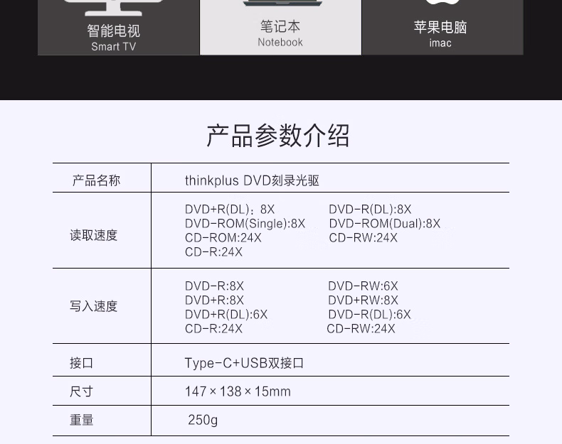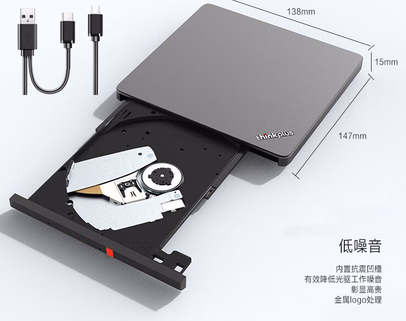 > 联想(Lenovo)DB85外置DVD刻录机8倍速铝合金Type-C/USB外置光驱 移动光驱
