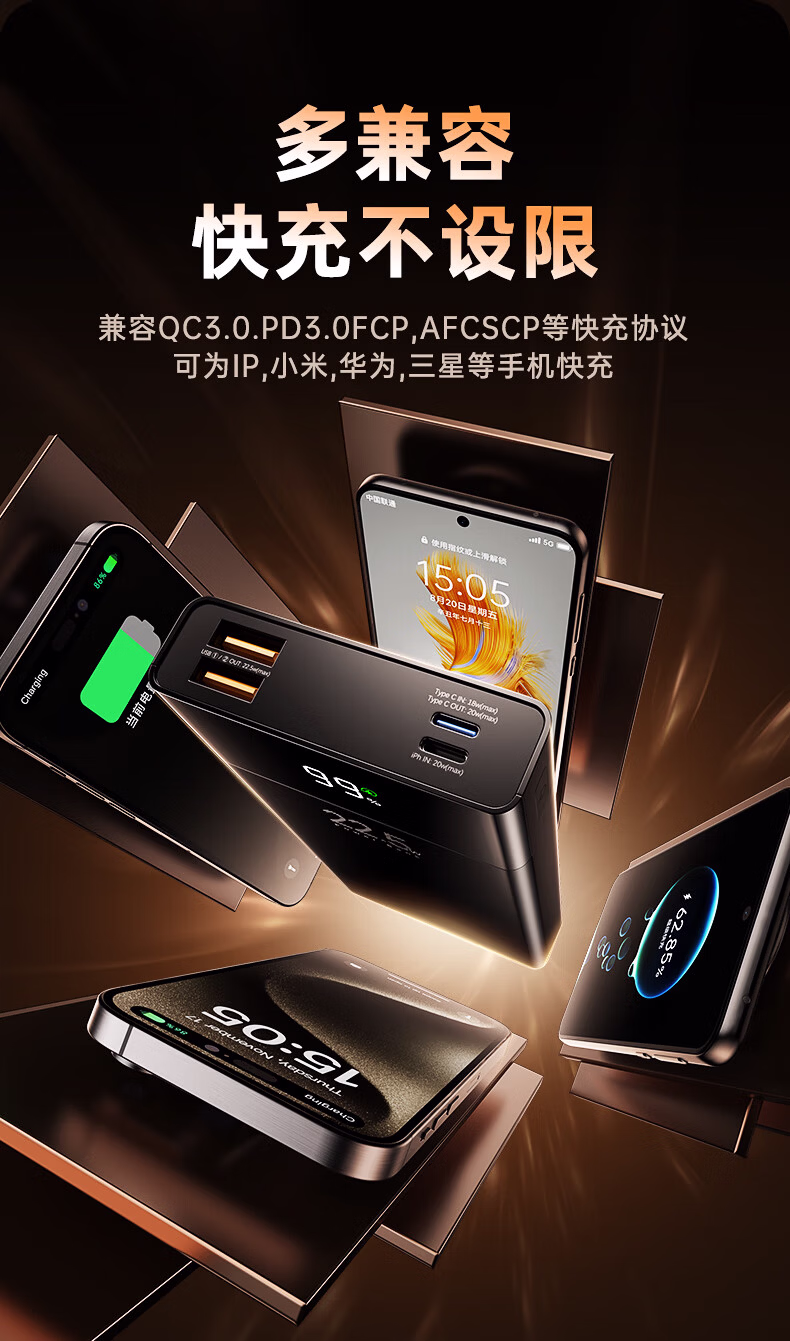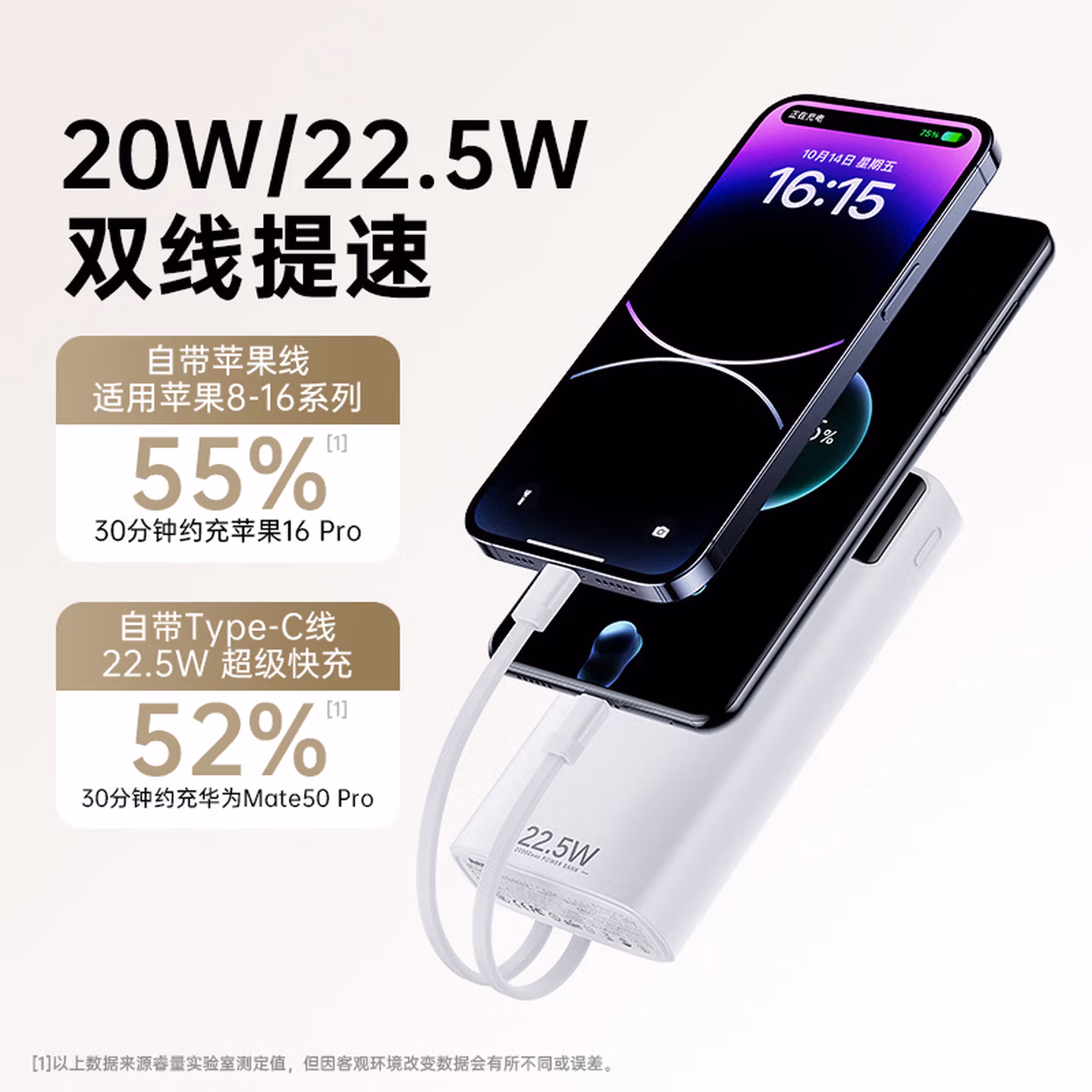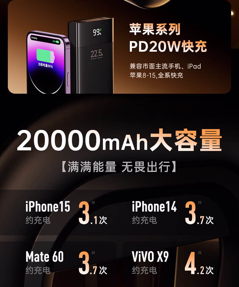 > remax睿量22.5W超级快充20000毫安时大容量充电宝移动电源PD20W双向快充适用苹果14/15安卓小米华为手机