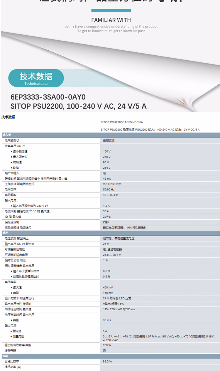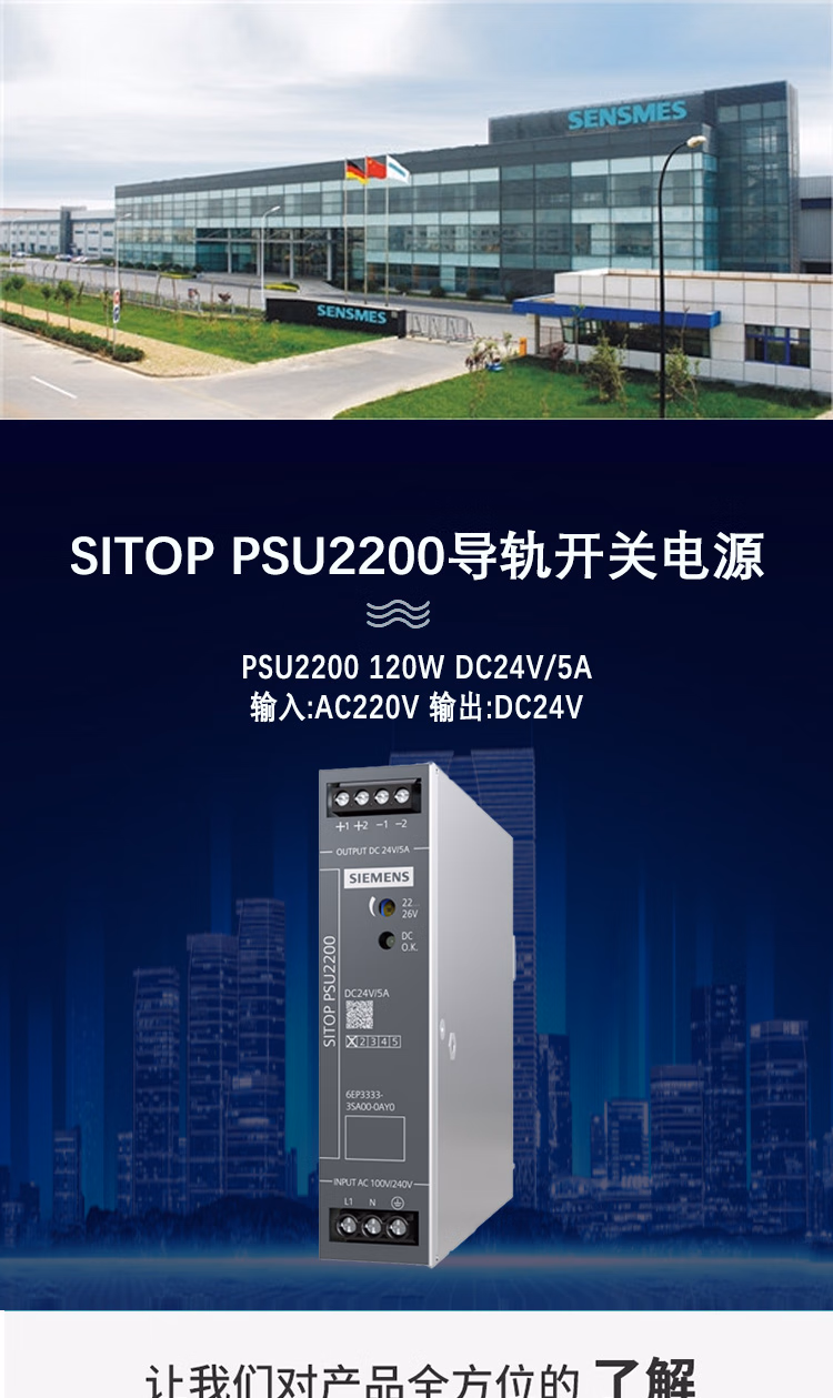 > 西门子 PLC可编程控制器 导轨开关电源 PSU2200 120W DC24V/5A;输入:AC220V 输出:DC24V 6EP3333-3SA00-0AY0