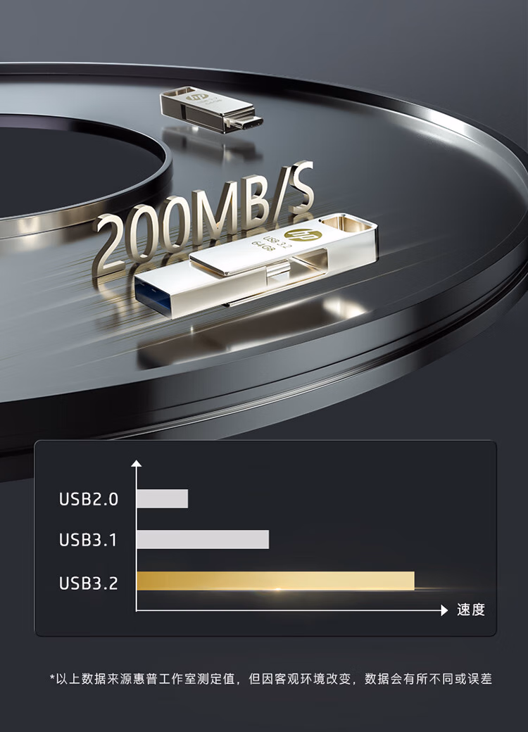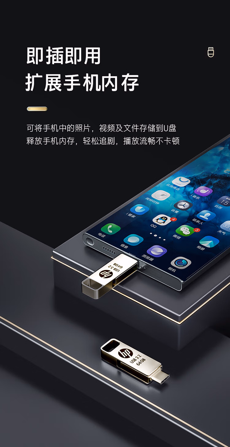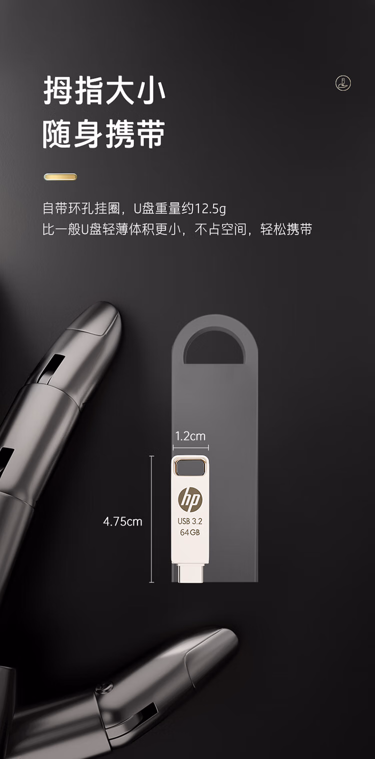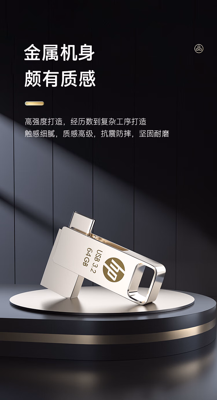 惠普64GB Type-C USB3.2 Gen1U盘加苹果lightning转接头 手机电脑U盘x206c 金属双接学习办公优盘