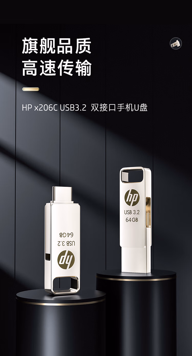 > 惠普64GB Type-C USB3.2 Gen1U盘加苹果lightning转接头 手机电脑U盘x206c 金属双接学习办公优盘