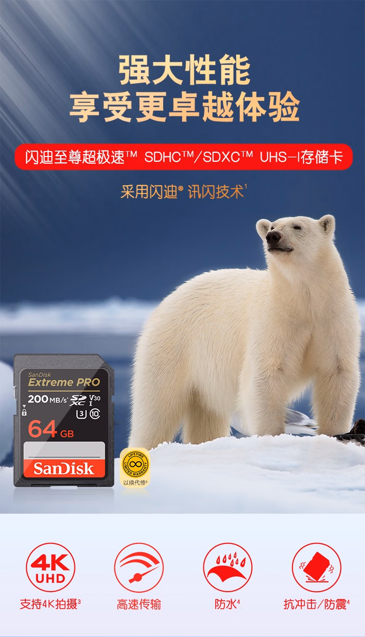闪迪相机卡 4K高清SD卡 UHS-I微单存储卡微单反摄像储存大卡内存sd卡内存卡 128G SD卡