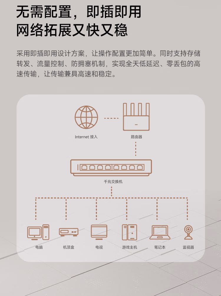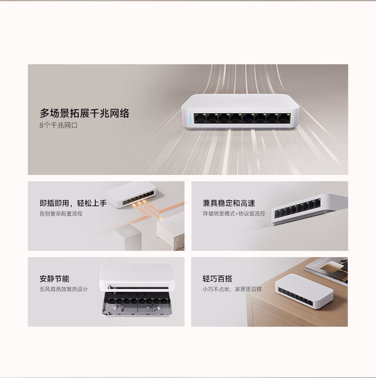 > 小米(MI)千兆交换机多场景拓展千兆网络 即插即用 存储转发 稳定高效 安静节能 兼具稳定和高速交换机