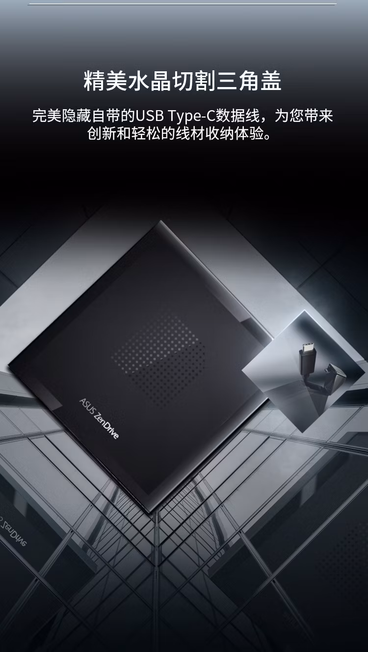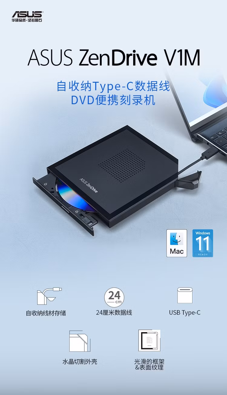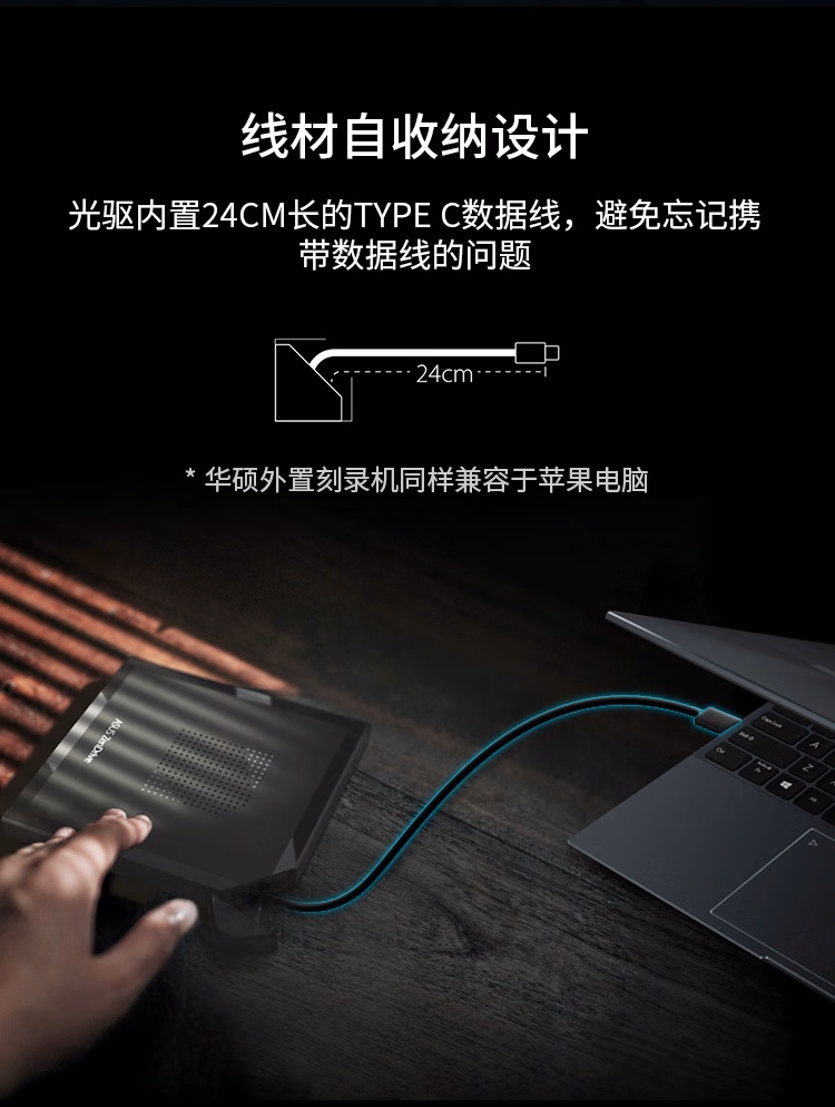 > 华硕8倍速 外置光驱 DVD刻录机 Type-C接口 线材自收纳(SDRW-08V1M-U 光影)