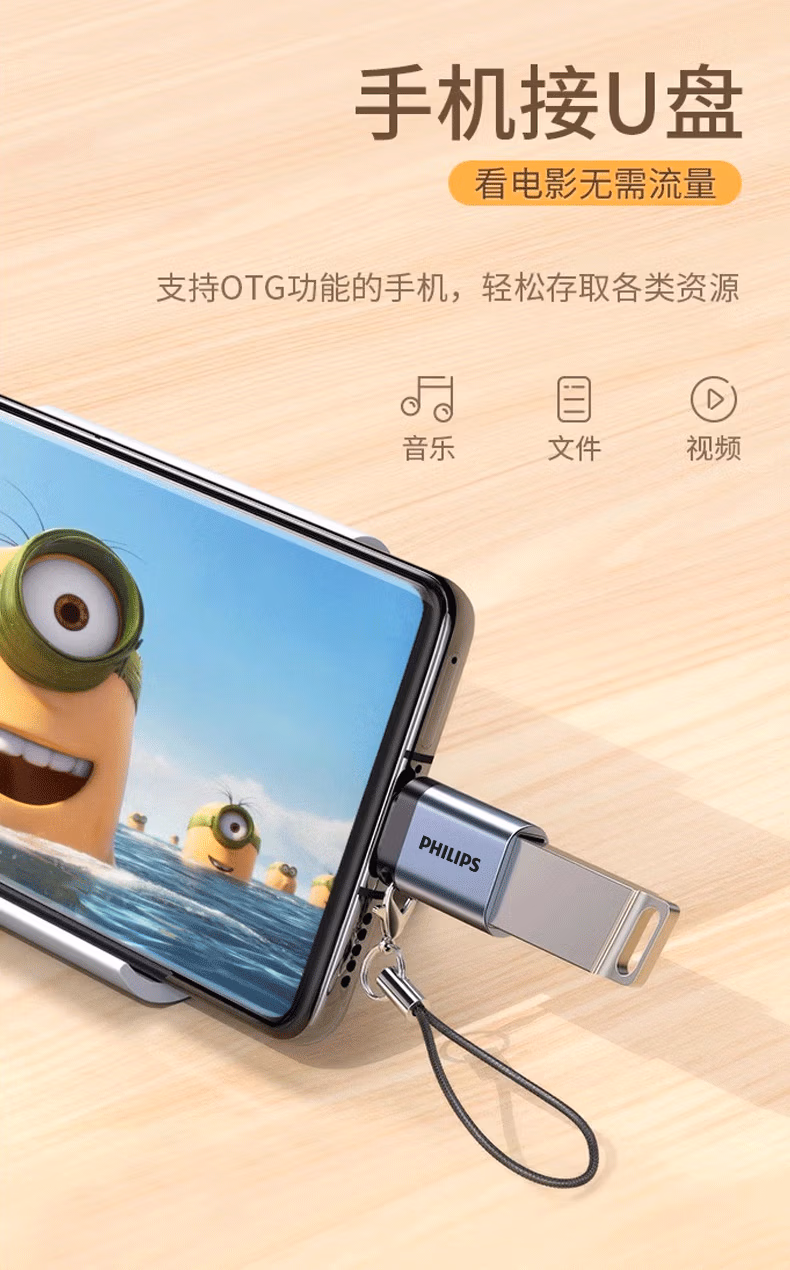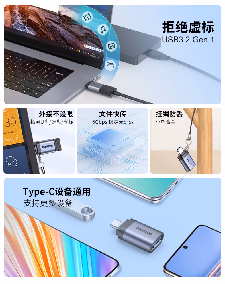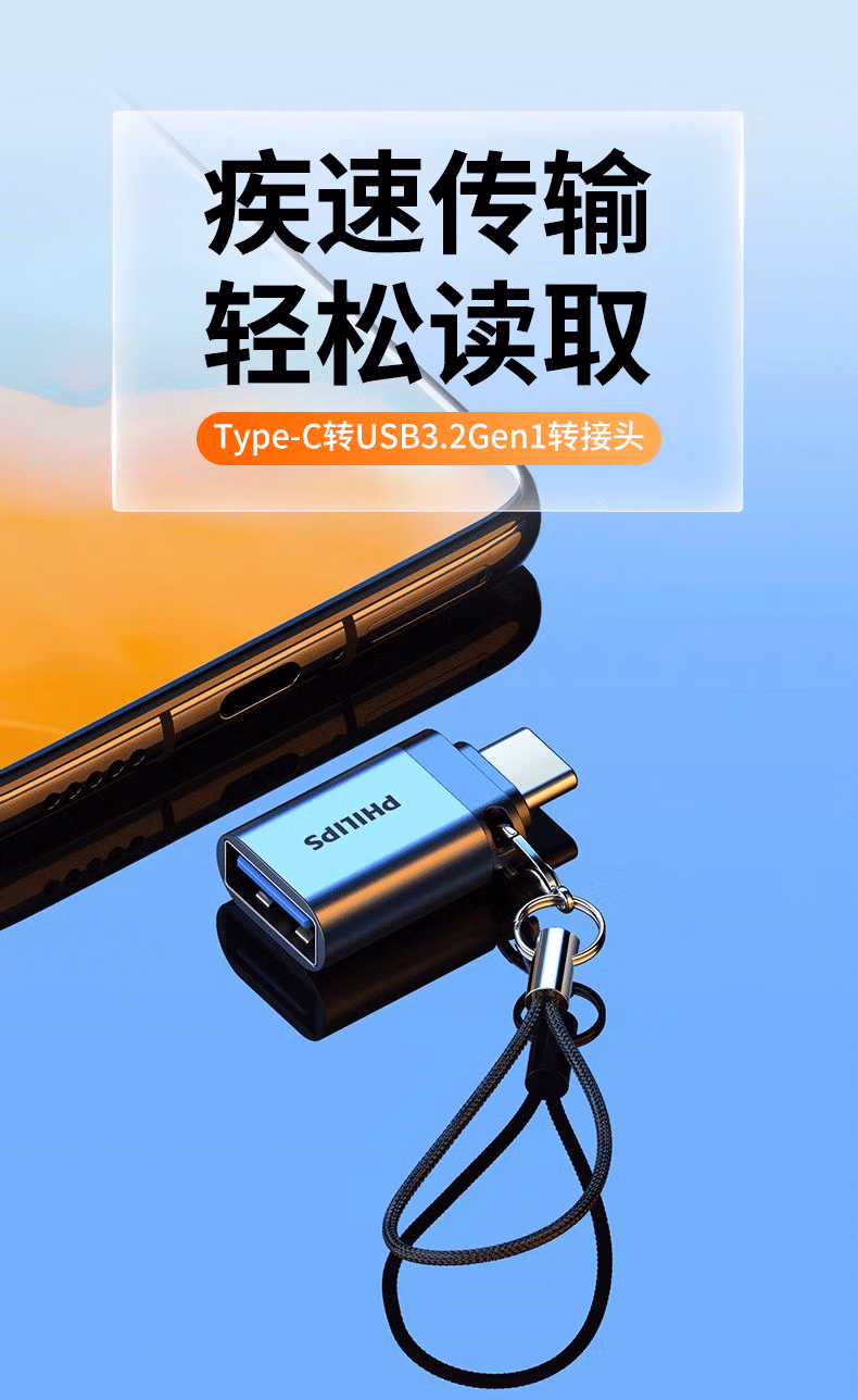 > 飞利浦(PHILIPS)USB转Type-C转接头电脑USB公转USB-C母接口充电数据连接线转换器适用华为耳机笔记本小米手机