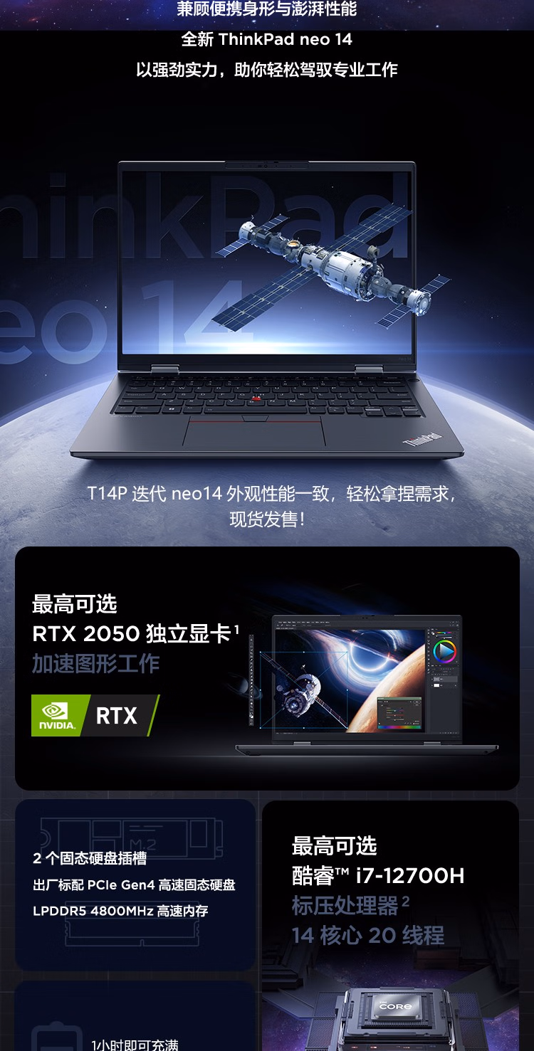 > ThinkPad联想T14p迭代款 Neo14 14英寸高性能轻薄本 商务办公编程工程师设计绘图全能本笔记本电脑 i7-12700H RTX2050独显 2.2K屏 16G 512G 高色域 人脸识别 标配