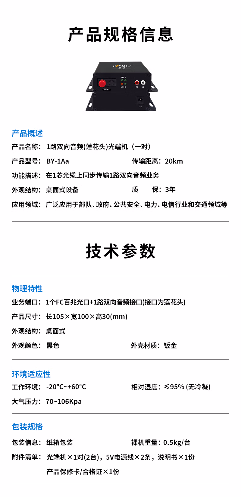 博扬(BOYANG)1路双向音频光端机 光纤音频延长器 语音光端机 莲花RCA接口 FC单纤20km BY-1Aa