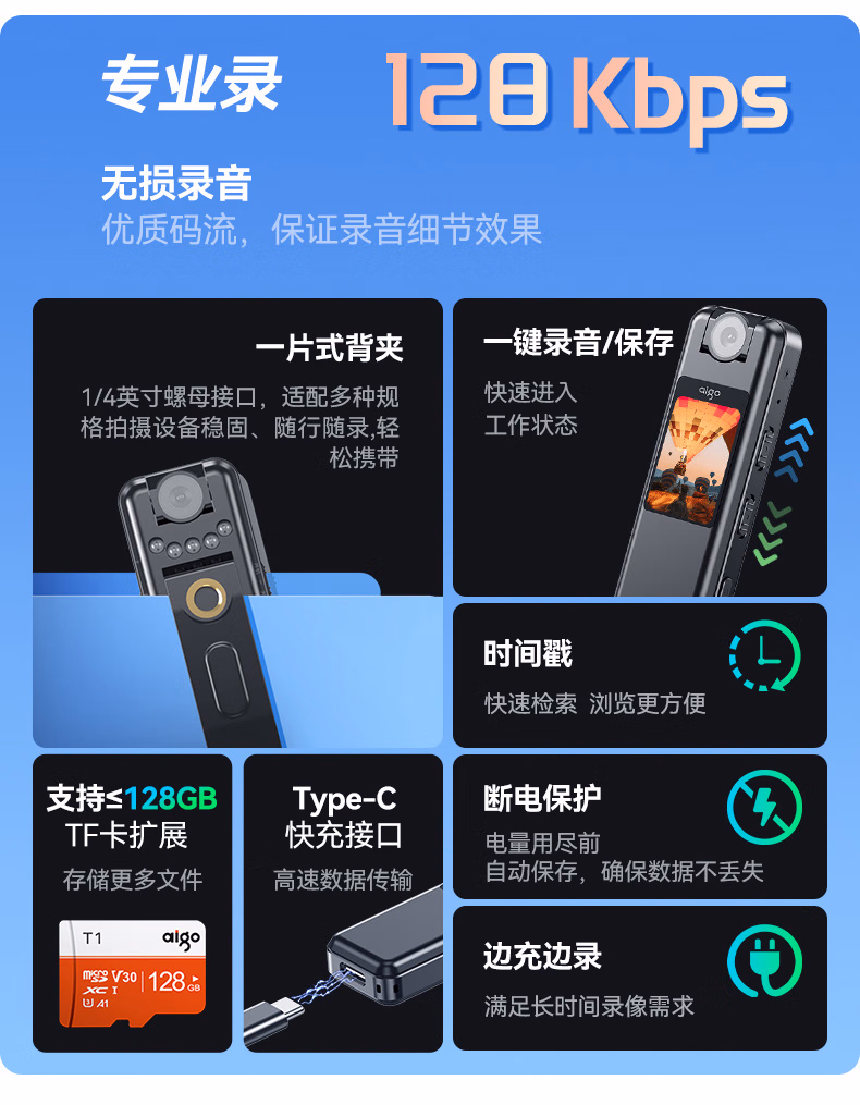 爱国者aigo录音笔R5515 专业高清降噪录音录像器 一键录音 会议培训 128G