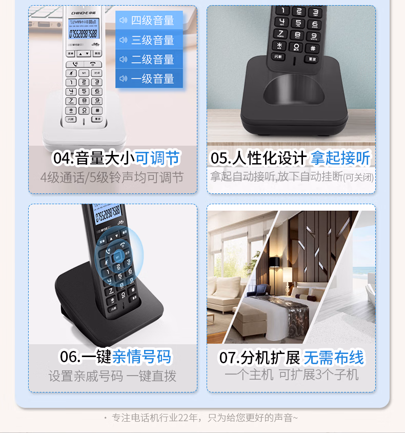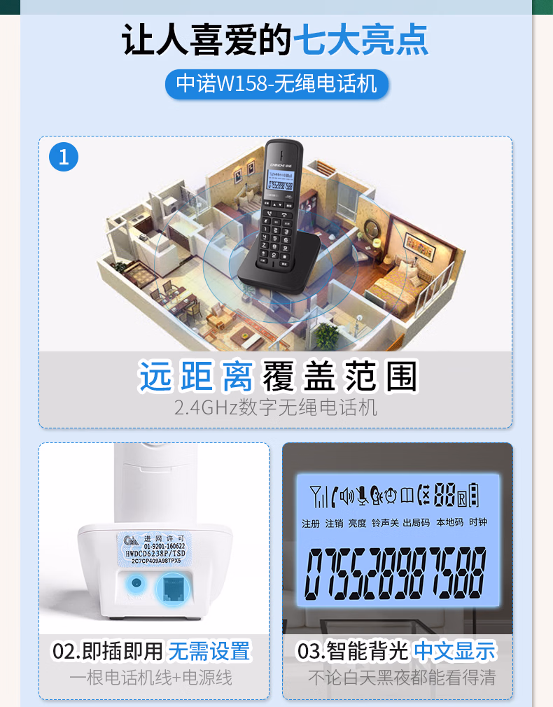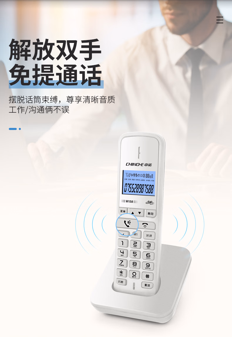 > 中诺无绳单机电话机中文菜单白屏背光单键拨号无线主机座机固定电话W158黑色