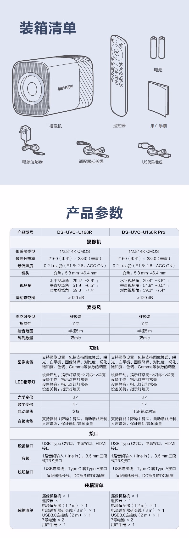 HIKVISION海康威视电脑直播摄像头4K超清摄像机8倍变焦升级tof聚焦竖屏网络娱乐抖快直播带货设备U168R pro