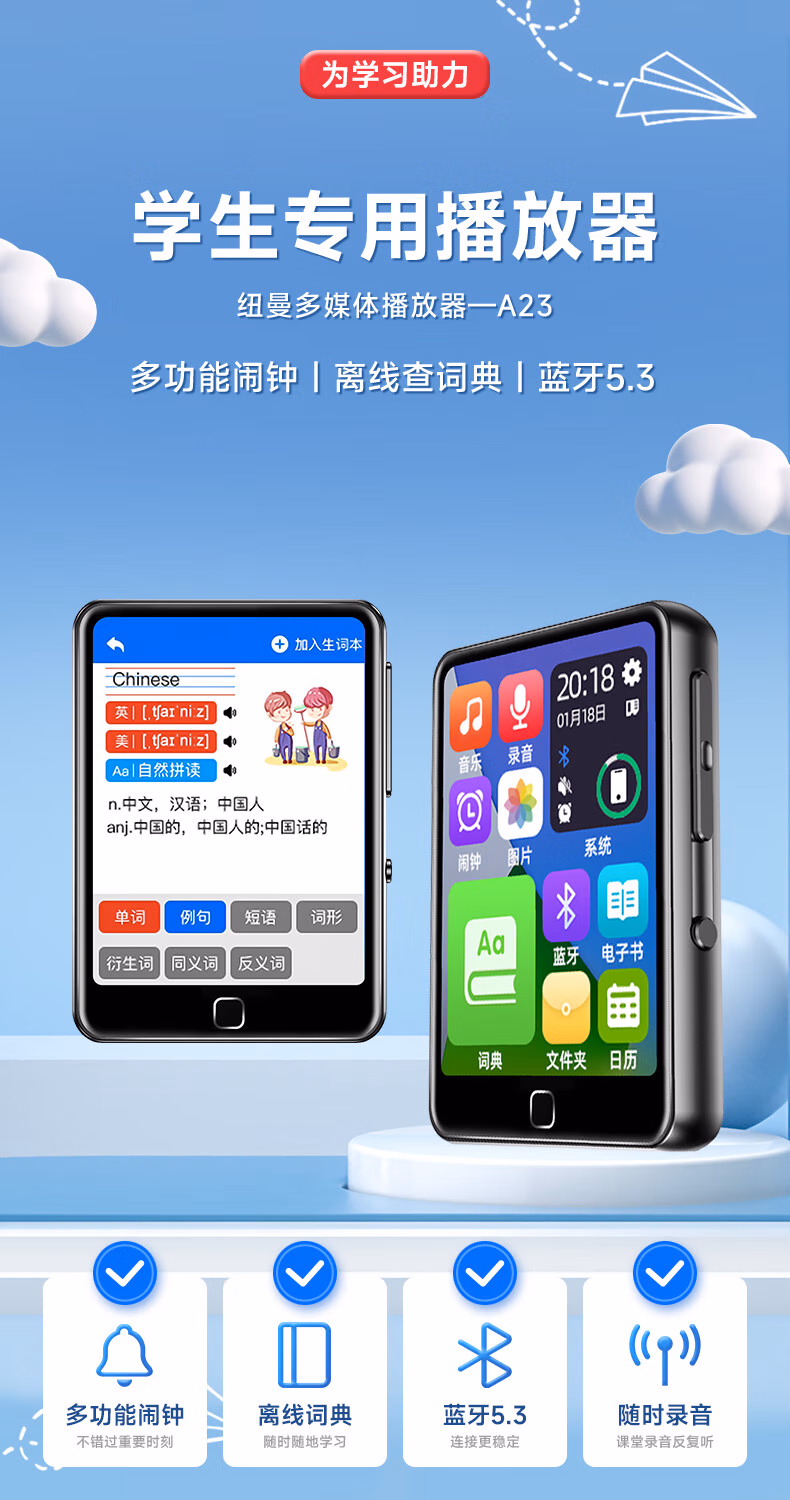 纽曼A23 mp3/mp4播放器无损音乐随身听 2.4英寸蓝牙5.3词典电子书录音学生听力复读机闹钟 触屏-蓝牙-发声词典-32G