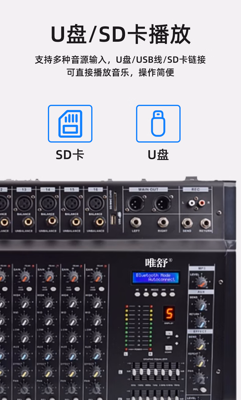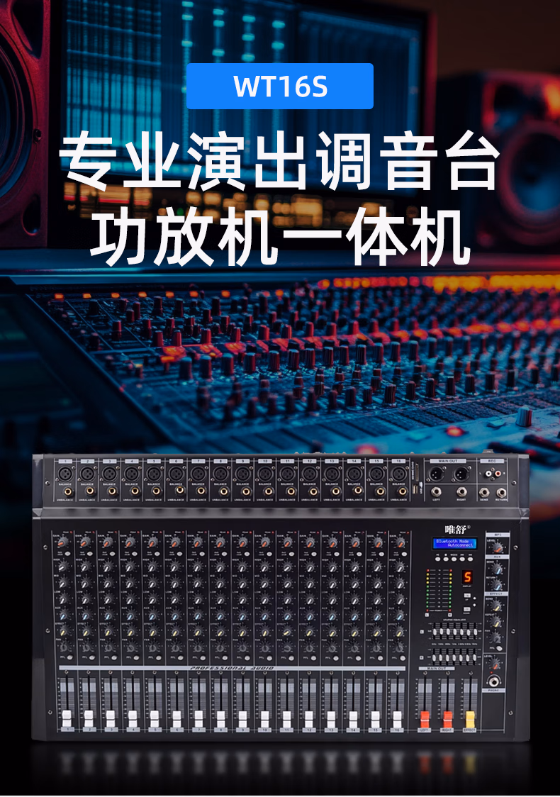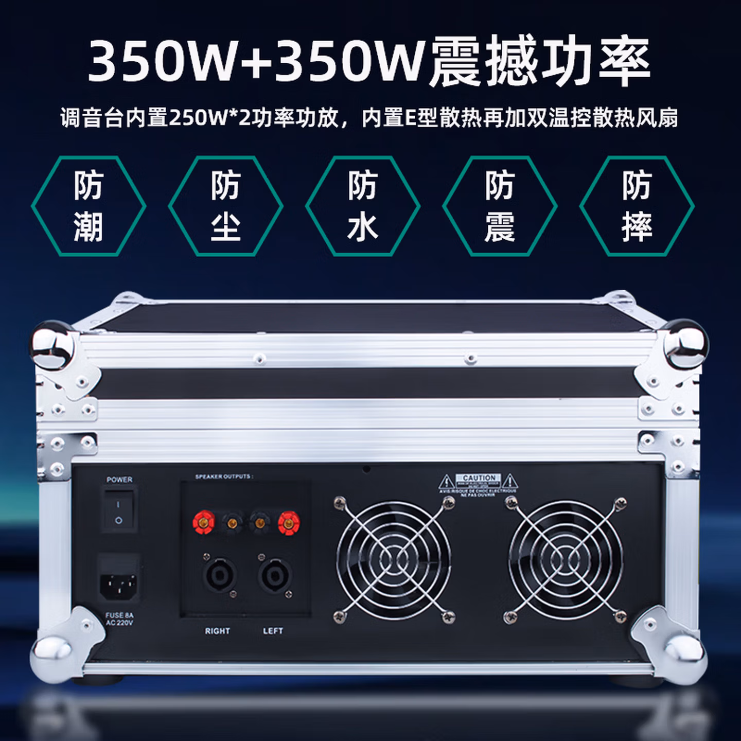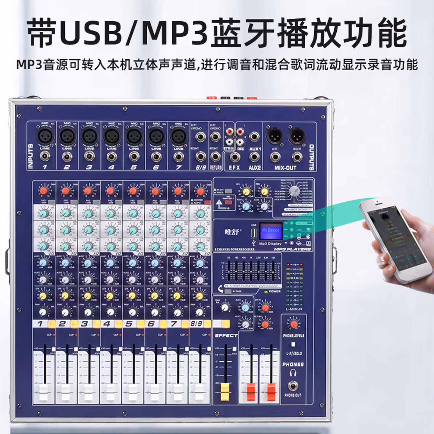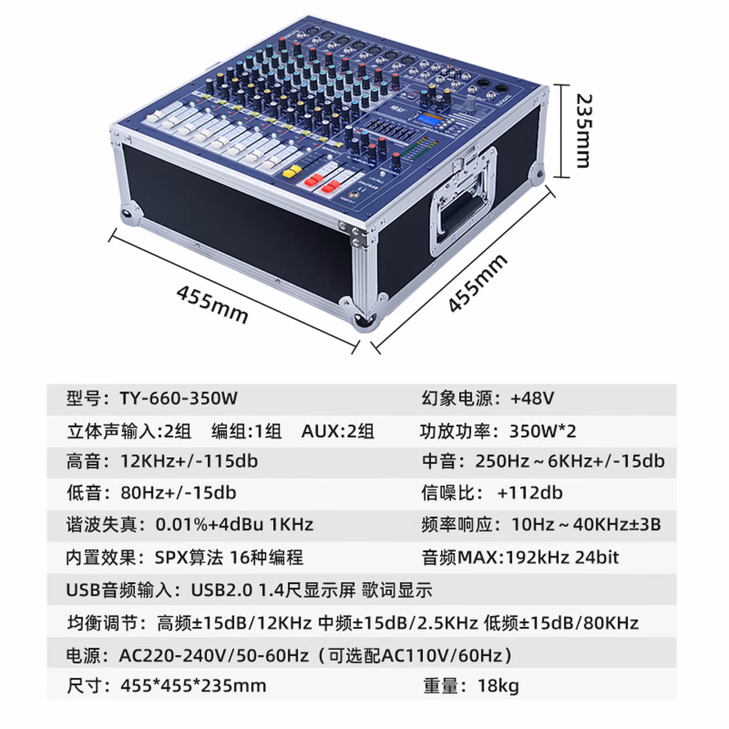 唯舒TY-660-350W专业调音台功放一体机9路航空箱式大功率350W功放机带MP3内置效果器带编组48V幻象供电