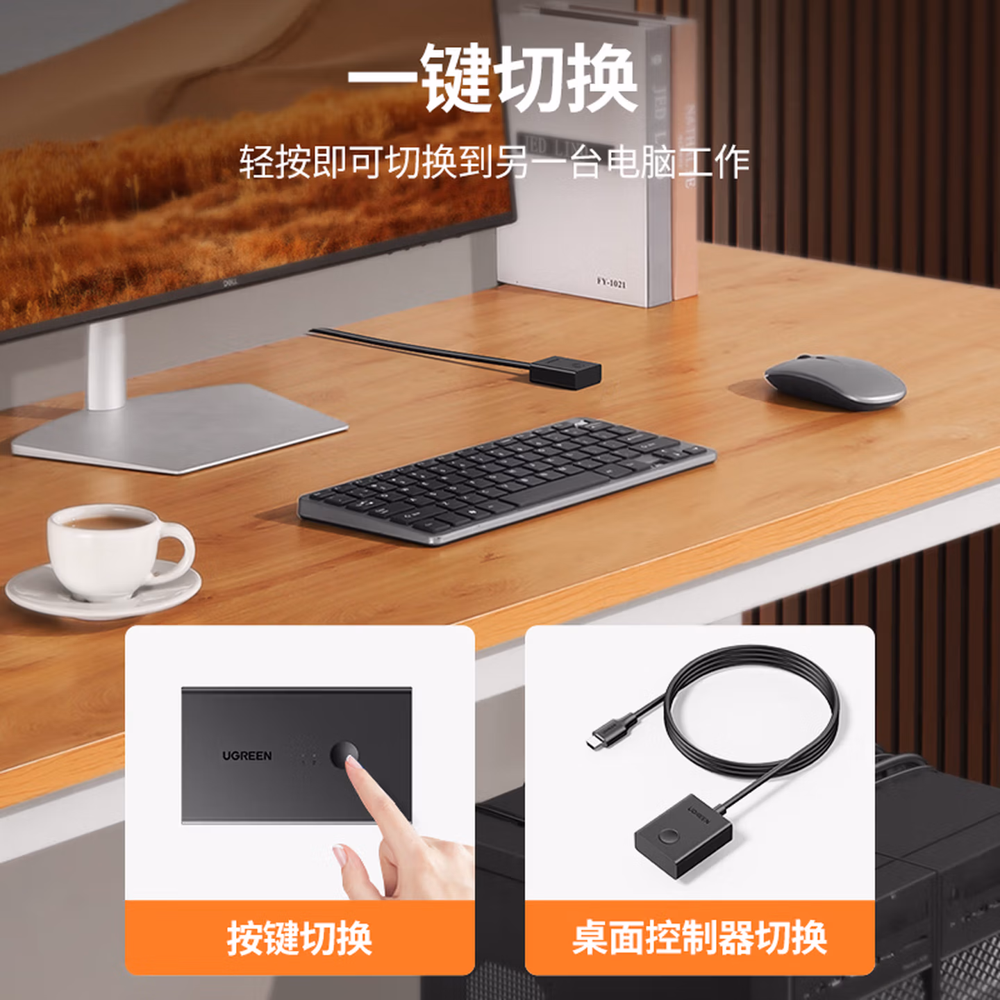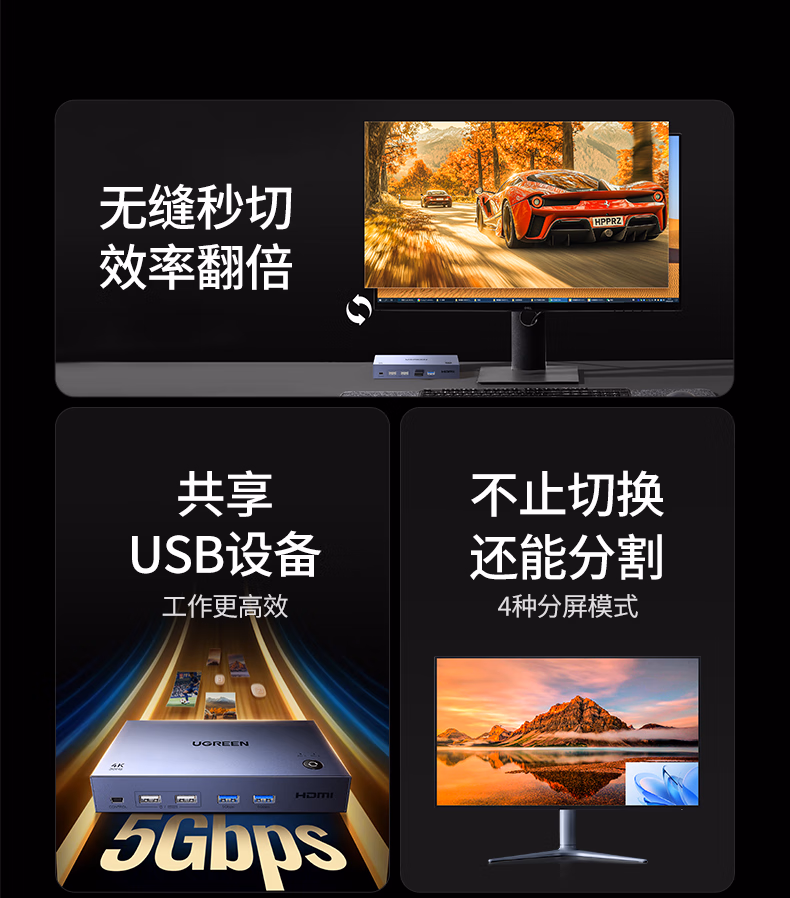 > 绿联HDMI KVM切换器4K高清视频切屏器二进一出 共享USB打印机/键盘鼠标接两台主机电脑共用显示器90809