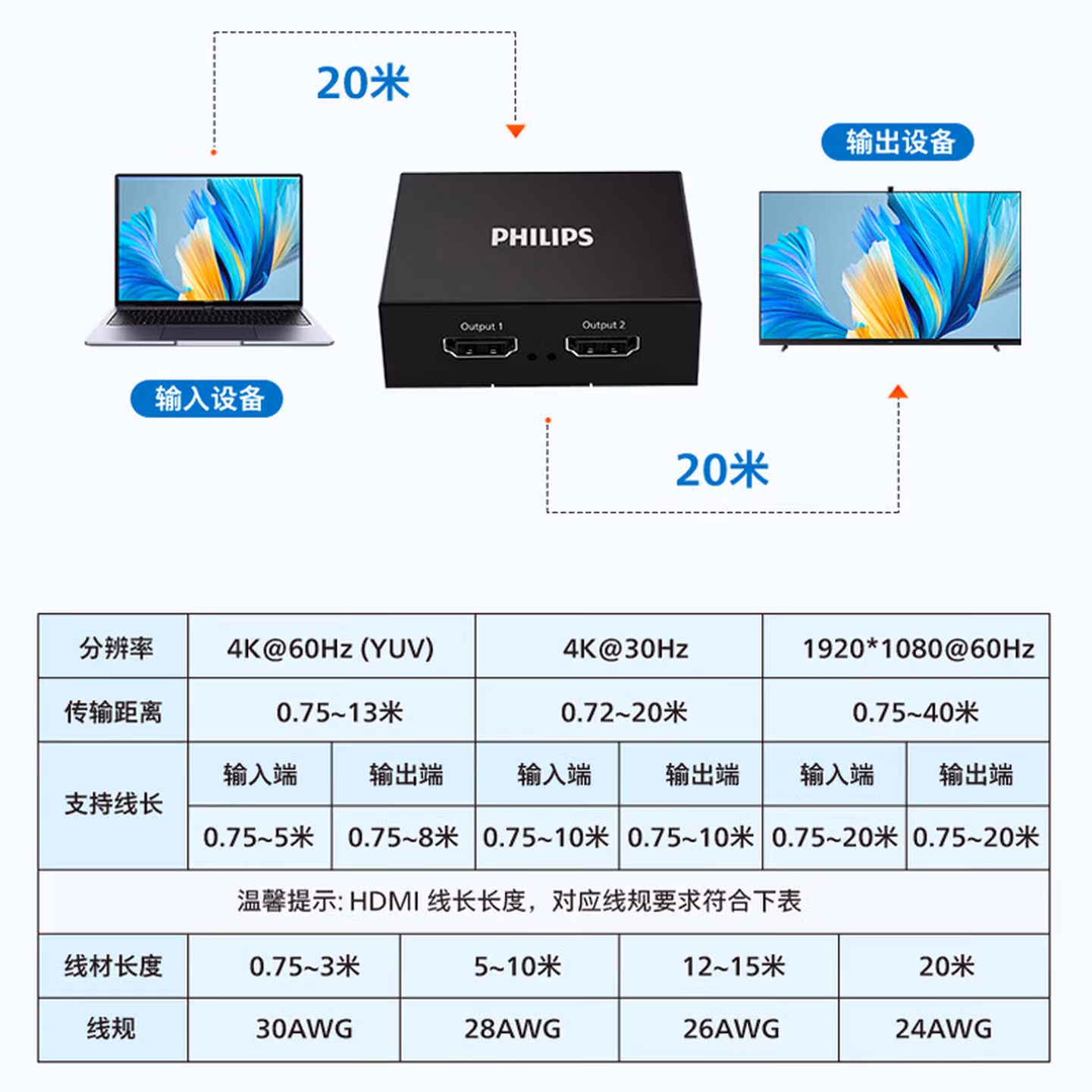 > 飞利浦 HDMI分配器1进4出/2出4K数字高清视频分屏器笔记本电脑电视盒子接显示器投影仪一分二/四 一进二出分配器(4K60Hz)