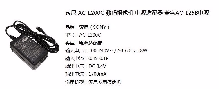 > 索尼摄像机AC-L200D/C电源适配器DC IN直充电器线HDR-CX680