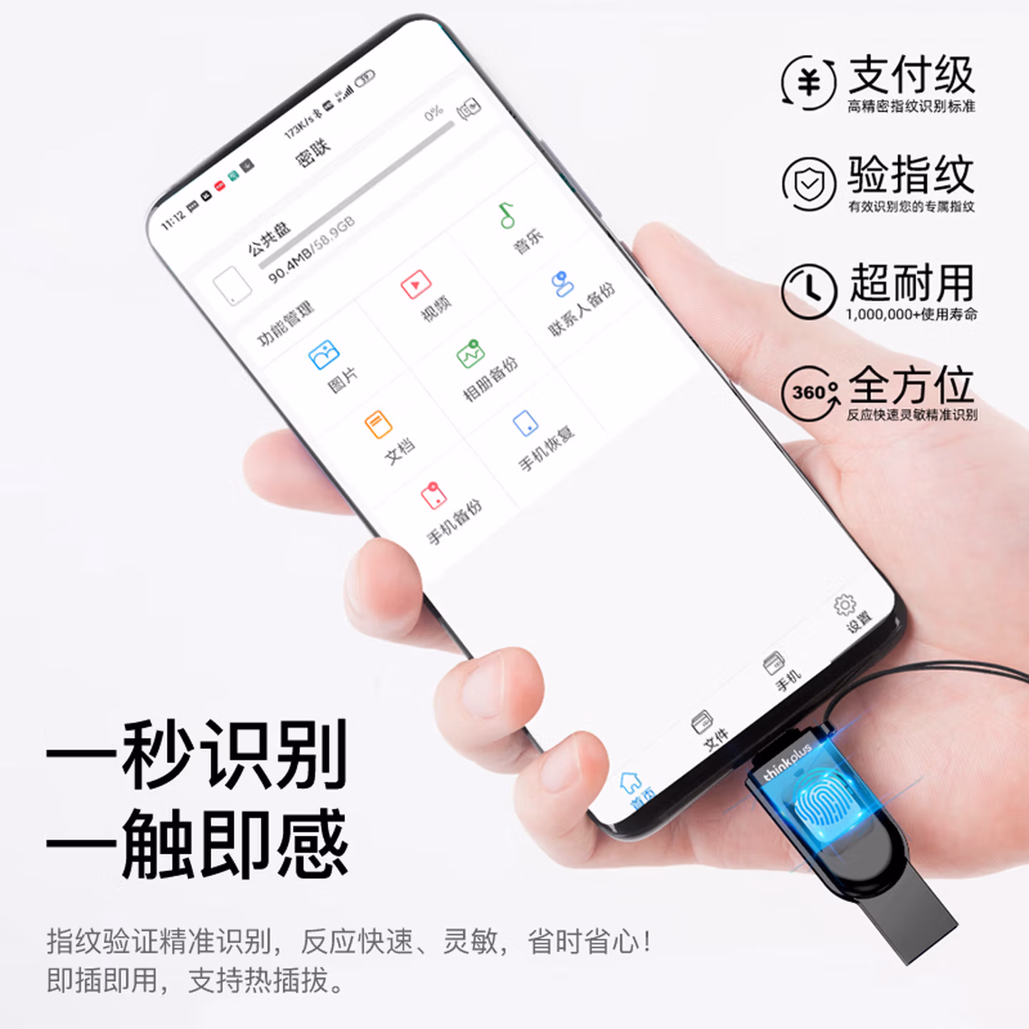 > ThinkPlus联想 256G U盘USB3.0 Type-C双接口手机直连电脑通用指纹加密防泄密商务办公优盘 TFU301系列