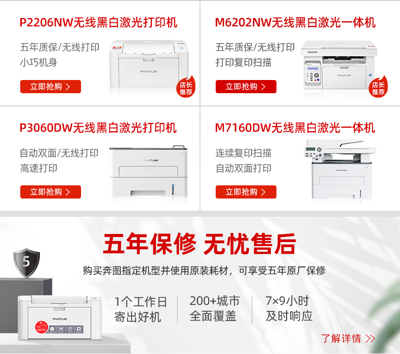 > 奔图(PANTUM)P2200W 黑白激光小型易加粉无线打印机